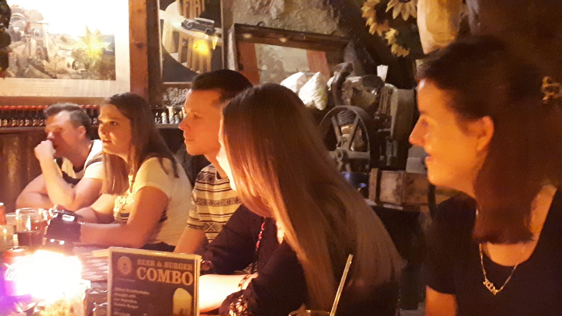 Na een middagje gekaart, gezwommen en vooral uitgerust te hebben, werd het tijd om een hapje te eten in Windhoek. Na op de bonnefooi door de koloniale Duitse straatjes genavigeerd te hebben - lachend om Duitse straatnaambordjes die uiteraard met een Duitse generaalsstem uitgekrijst moesten worden - belandden we in een prachtig restaurant: een soort strandbar met een hoop muziek waarvan de menukaart louter uit vlees bestond. En wát voor vlees: springbokbiefstuk, antilope en krokodilfilet. Niet je alledaagse kerstdinertje. Springbok is volgens de rest van de groep fantastisch, maar ik koos, als enige, voor die laatste. Niemand van ons had ooit krokodil gegeten en schijnbaar was dat, ook al is het Namibië, geen alledaags gerecht in deze contreien, dus die kans liet ik niet aan me voorbij schieten en spijt zou ik er niet van krijgen. Krokodil is met recht het allerlekkerste vlees dat ik ooit gegeten heb! De textuur van kippenvlees en zó mals dat je tanden er als een heet mes door zachte boter heen snijden. Laat de rest maar hun gazelles en springbokken vreten; krokodillenvlees spant de kroon.
