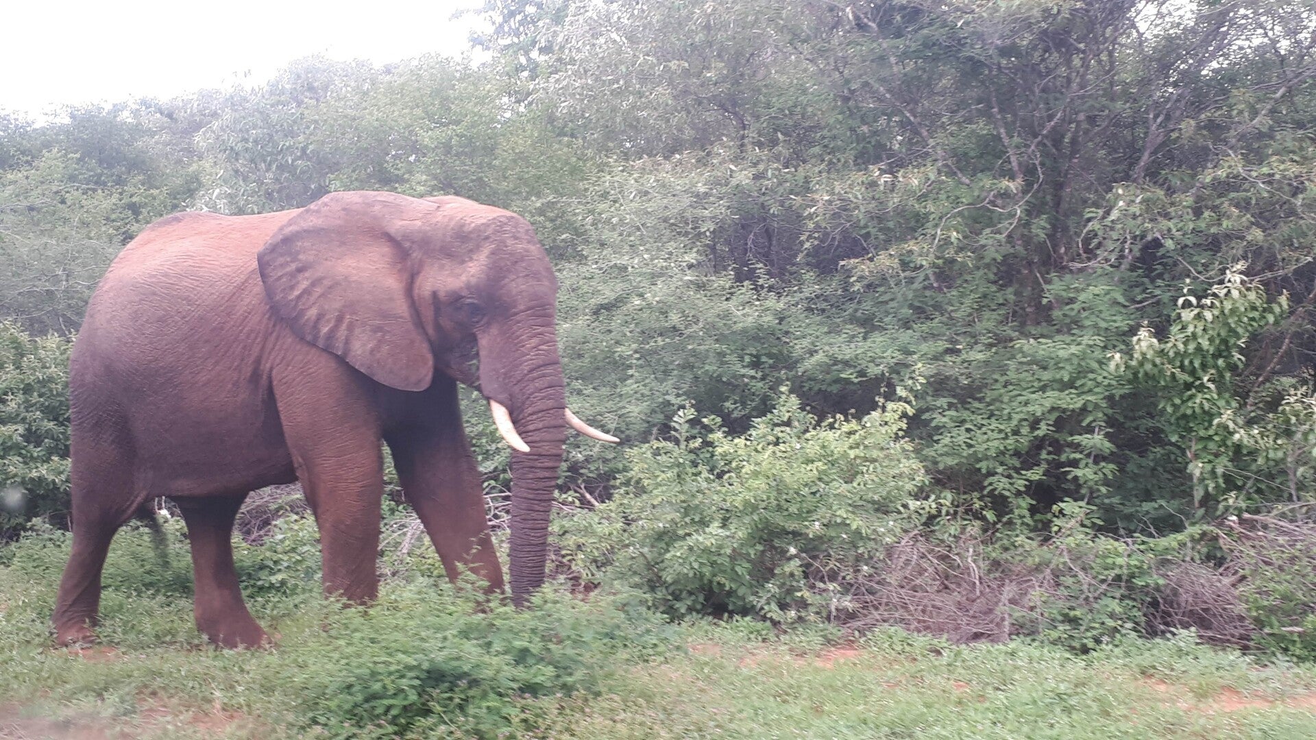 We moesten nog een kleine twintig minuten rijden om bij de grensovergang met Zimbabwe te komen en onderweg kwamen we oog in oog te staan met nummer twee van de Big Five: de olifant! Botswana blijkt 'last' te hebben van een olifantenplaag. De olifant heeft hier een overvloed aan natuurlijke voedselbronnen en geen enkele andere diersoort die een bedreiging voor het beest vormt. Het resultaat? Olifanten, olifanten en nog eens olifanten. Zo erg dat ze met regelmaat verdoofd worden en dat ze verscheept worden naar andere Afrikaanse landen. En waar kwamen we onze eerste olifant tegen? Met drie poten in de berm en de andere op de doorgaande weg. En laat me je vertellen: de Toyota's die we hadden zijn geen partij voor deze kolossen. Voor de mensen die wel eens olifanten in Azië hebben gezien; dit zijn geen kleintjes. Dit zijn reuzen. Imposante, intimiderende, wonderbaarlijke reuzen. En dan is het wachten geblazen. Staat er hier een olifant op de weg, wat meer dan eens voorkomt, dan geef je zo'n beest het respect dat hij verdient. Of ja, verdient, je zal wel moeten, want rijd je erlangsop, dan kom je in zijn personal space (geen drie wangkusjes op verjaardagen van olifanten). Toeter je, dan ben je al helemaal levensmoe. Begint een olifant je interessant te vinden en begint hij met zijn oren te wapperen? In de achteruit en maak dat je wegkomt. En dus wacht je, maar wachten is zelden zo interessant en spannend geweest.
