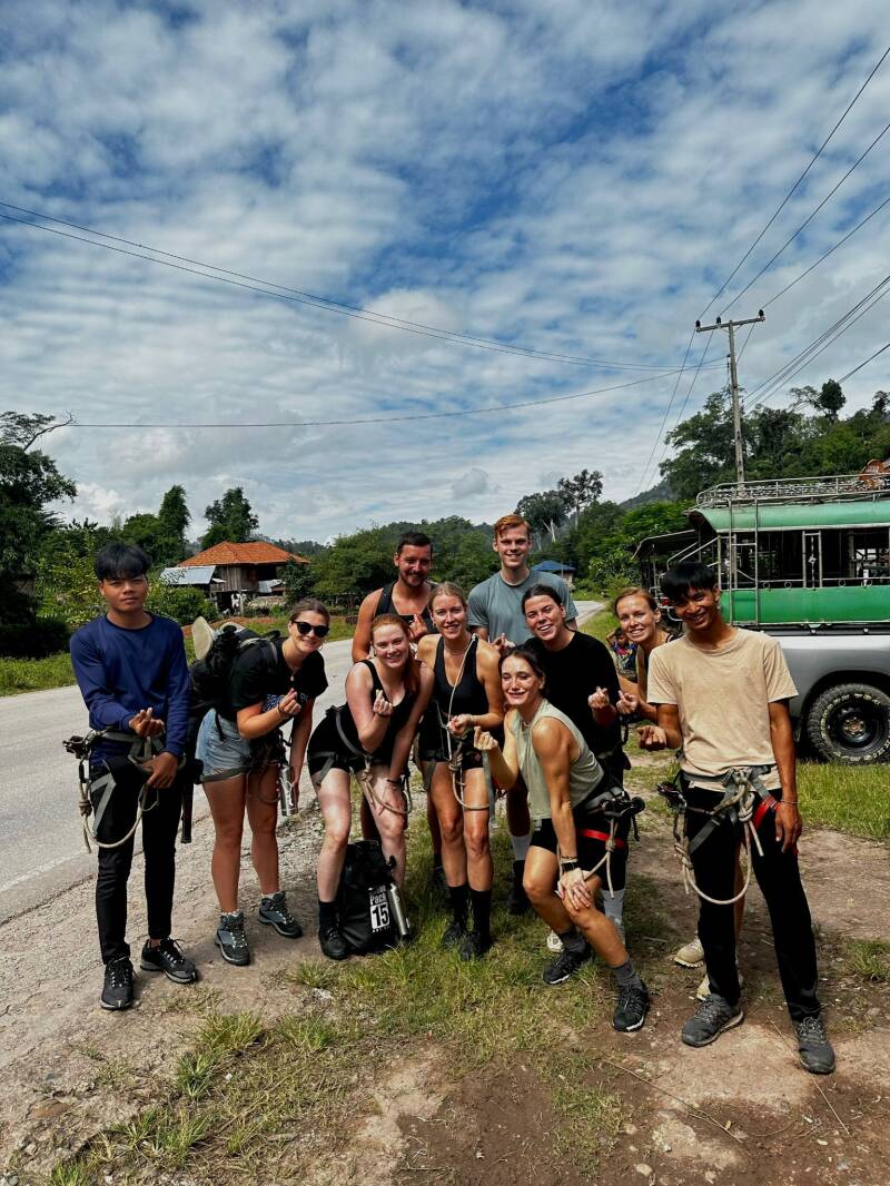 Rond het middaguur en acht fantastische, laatste ziplines later, arriveerden we in weer zo’n nederzettinkje, waar we heerlijk konden lunchen en verwelkomd werden met een idyllisch uitziend watervalletje dat over een verzameling colablikjes en flessen Beerlao (Laotiaans biermerk met een bijzonder originele naamkeuze) heen viel. Schijn bedriegt, want dit Beerlao bleek inderdaad lauw bier te zijn, maar na zo’n intensieve dagen leg je de tevredenheidslat al snel wat lager, merkten we. Een pick-uptruckje bracht ons met de meest wilde tocht aller tijden (afgelegen stukken in Suriname, Namibië of België zijn hier écht niks bij) via een zandweg vol keien, gaten, afgronden en stromende beekjes – waarbij we God op de blote knieën mochten bedanken dat de enige drie tegenliggers scooters in plaats van auto’s waren – uiteindelijk naar de hoofdweg, waar we afscheid namen van Lin, Kee (de absolute MVP van deze twee dagen) en vervolgens ons reisgezelschap. Althans, misschien voor korte duur. Inara en Jessy gingen naar Thailand, want ze legden de omgekeerde route af, maar om diezelfde reden kruisen onze paden wellicht nog wel. Fianne, Sam, Mette en Indra gingen net zoals wij met de slowboat naar Luang Prabang. Die gedachte was fijn: in amper anderhalve dag tijd kun je mensen heel snel leren kennen.