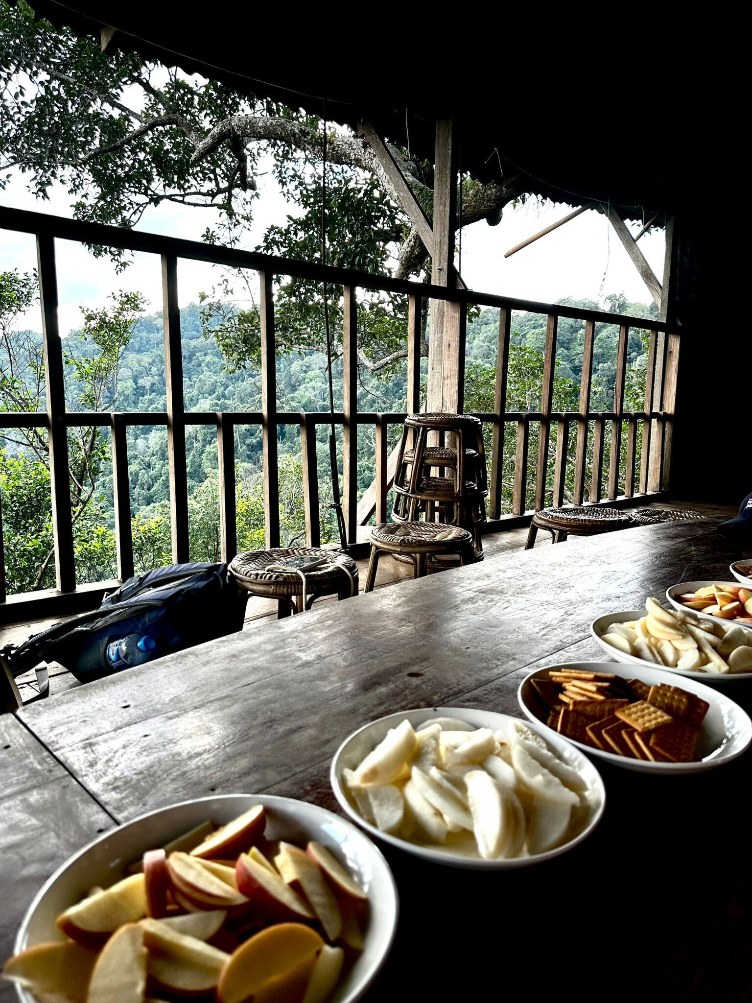 Houayxai staat bekend als een slaperig grensplaatsje en is meer een tussenstopje om op adem te komen voor je de grens oversteekt of wanneer je, zoals wij, vanuit Thailand arriveert en Laos gaat verkennen. Slapen en snel verder dus? Nee, zeer zeker niet. Houayxai is ook het beginpunt van de Gibbon Experience: tokkelen door de nabijgelegen jungle. Klinkt goed? Klonk het ook voor ons, dus een no-brainertje om op de bucketlist te zetten, wat we al gedaan hadden voor we überhaupt het vliegtuig richting Azië ingestapt waren. Onze verwachtingen klopten, de Gibbon Experience was ongelofelijk. Eerst nog even een goed hapje eten de avond van te voren met een prima uitzichtje!