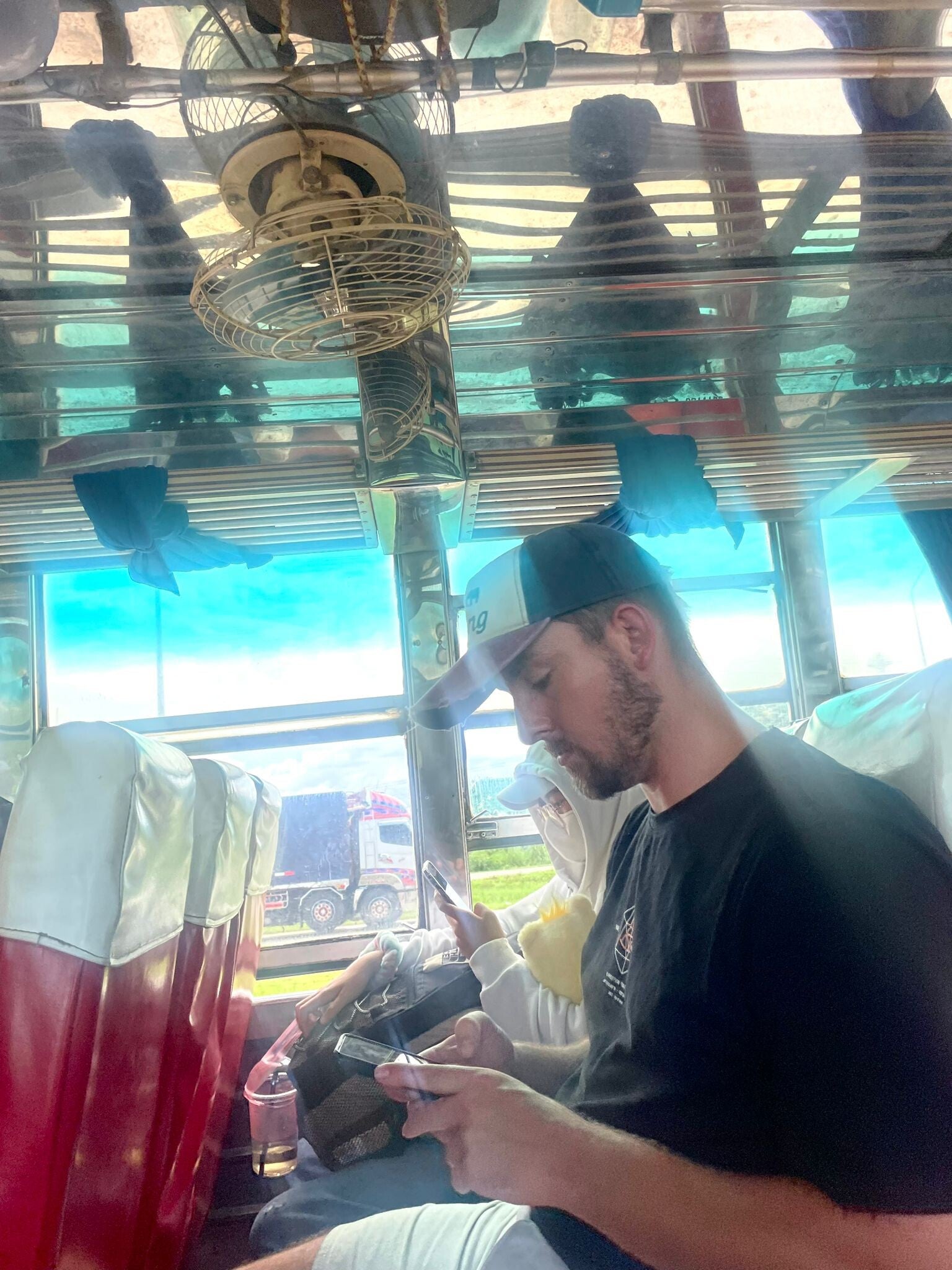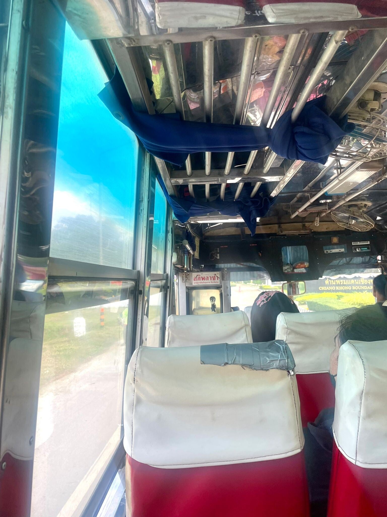De stoeltjes waren nog comfortabel ook. Het was eindelijk weer lekker weer (nét nu we Chiang Rai verlieten, bedankt weergoden) en het gebrek aan airco werd gecompenseerd met een paar kriskras geplaatste ventilatoren en openstaande deuren. Ja, openstaande deuren. De bus bevatte een voor- en achteringang en beide deuren zijn geen seconde dicht geweest gedurende de complete route naar Chiang Khong. Safety first is ook maar relatief, natuurlijk. Uiteindelijk is het belangrijkste dat we gewoon een prima tochtje naar de grens hebben gehad en dat we in de toekomst zeker nog wel eens gebruik gaan maken van wat alternatiever vervoer. Brengt toch wel weer wat avontuurlijks met zich mee. Bij de grenspost staken we middels een busje via de Friendship Bridge over naar Hoayxai, de Laotiaanse tegenhanger van Chiang Khong, om lekker te overnachten. Toen we bij de Laotiaanse grenspost aankwamen, ontdekten we dat we vandaag een enorme feestelijke gelegenheid over het hoofd gezien hadden: mijn paspoort was jarig! 11 oktober 2023, de dag dat we de zevende verjaardag van mijn paspoort vierden. What a day to be alive.
