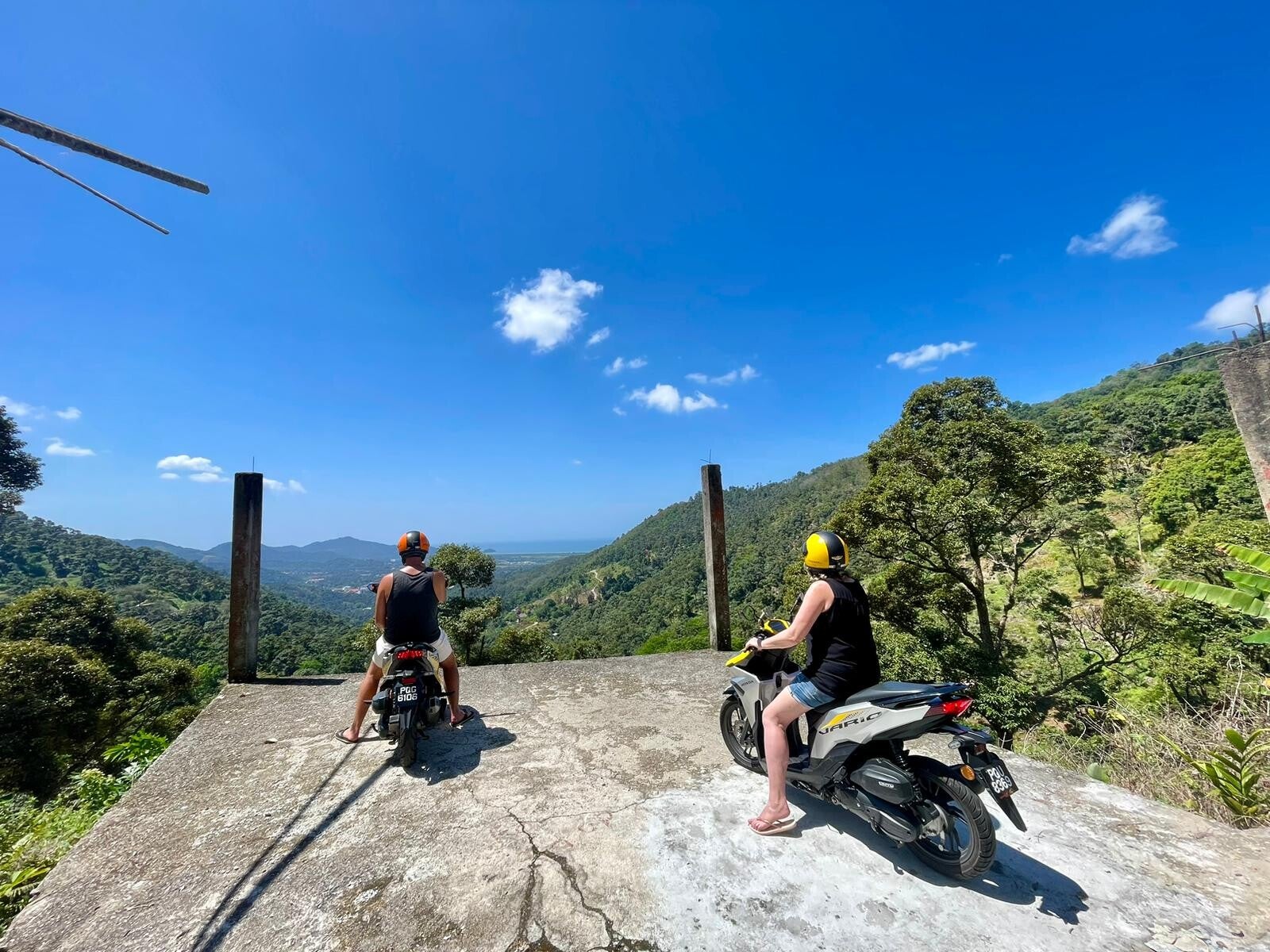 En dan begint de dodemansrit. We wijken af van de autoweg naar een motorpad dat dwars door de jungle heen loopt. En het is niet zo maar een weggetje. Wij zijn de zandbakken en de modder van Koh Rong gewend en de Laotiaanse gravel die voor asfalt door moet gaan, dus ons heb je niet zo snel op de stok gejaagd, maar deze route was weer een uitdaging op zich. De hoogste punten van eilanden liggen (logisch) doorgaans in het midden. Dat betekent dat we ongeveer op het hoogste punt van de route zijn op het moment dat we in het midden van het eiland zitten. De weg daarna? Die leidt steil omlaag. En met steil, bedoel ik heel steil. Stel je een kronkelig fietspad voor dat zo’n twee kilometer aan één stuk door omlaag gaat. Niet zomaar omlaag, maar soms in een hoek van 45 graden. Continu hou ik mijn remmen ingedrukt. Als ik iets te hevig begin te hopen dat mijn remmen de conditie hebben van een Keniaanse marathonloper, maken onze harten een sprongetje als de rechterrem ermee ophoudt en het einde van de daling nog niet in zicht is. In een zo langzaam mogelijk slakkentempo vervolgen we de weg in de hoop dat de linkerrem nog niet op het eind van z'n latijn zit. De angst om de afgrond in te denderen wordt enigszins getemperd door de gedachte dat als het zou gebeuren dat onze linkerrem het onverhoopt zou begeven, we in ieder geval met een weergaloos uitzicht op Gods voordeur zouden kloppen.