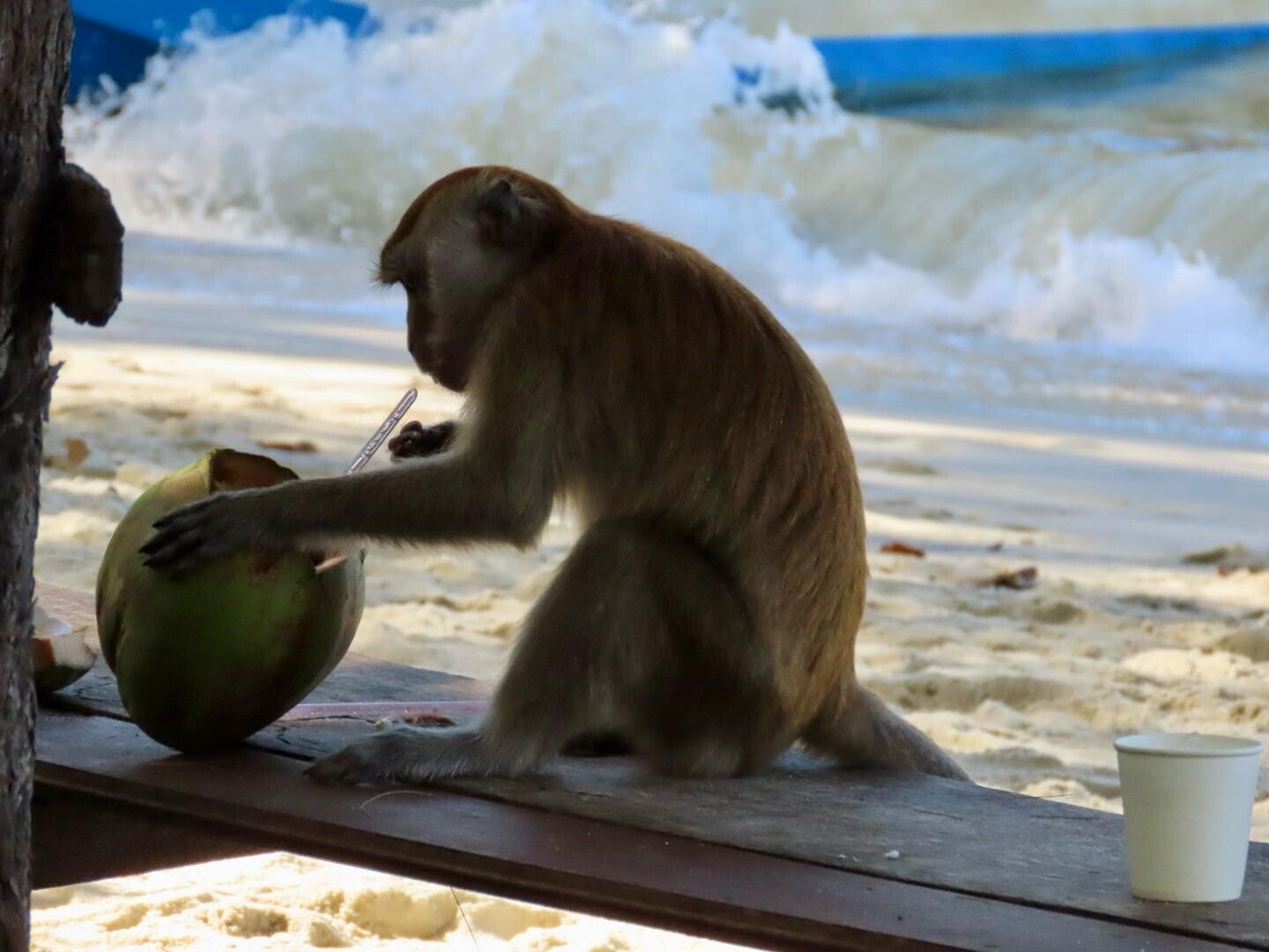 Monkey Beach heet niet voor niks Monkey Beach. Nadat ik een kokosnoot koop en Geertje en Anita een blikje fris op de kop tikken, zien we overal waar we kijken van die typische, Aziatische langstaartmakaken rennen en klimmen. Eerder is al gebleken dat die beesten niet mensenschuw zijn en dat geldt ook voor deze exemplaren. Niet meer dan eens wordt er een kokosnoot ontvreemd en als Anita met Geertje een ommetje maakt op het strand en ik weer typisch niet op zit te letten, is onze bus c-merk Pringles ook opeens verdwenen. Ik probeer Geertje nog de schuld te geven dat ze de bus in haar eentje soldaat gemaakt heeft, maar die strategie oogst bijzonder weinig succes. Een uurtje wordt een anderhalfuur (Maleisiërs blijken niet zo van de tijd) en we worden met de boot weer teruggebracht naar de ingang, waar we een taxi – die ook verrekte lang op zich laat wachten – terug nemen naar ons appartement boven Island Plaza. Nou, Anita, dat was best een intensief dagje. Applausje dat je dat met je geschatte zestig jaar toch maar even bol weet te werken. Petje af! Ik denk dat menig vrouw van Sarahleeftijd dubbel zo lang over die hike zou hebben gedaan. Dus we zijn trots op je, (schoon)moeders!