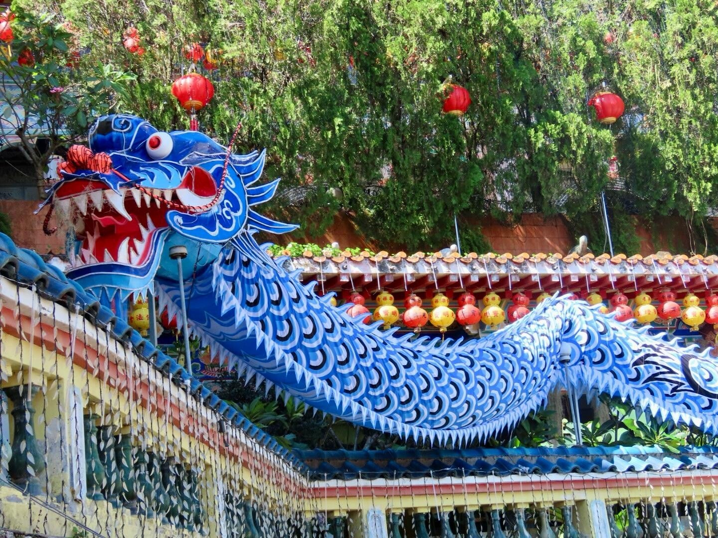 Alles waar je aan denkt bij een Chinese mythe, komt tot leven in de Kek Lok Si tempel. Lampionnetjes overal waar je kijkt, prachtige tuinen, lange, slangvormige Chinese draken, karakteristieke architectuur en meer Boeddhabeelden dan dat er scooters op Penang rondtuffen. Een minilift die wat wegheeft van dat pendeltreintje bij Penang Hill brengt ons een verdieping hoger en daar staat me een bouwwerk: een bladgouden Boeddhabeeld van een kwartslag gekanteld half voetbalveld groot! Alsof het allemaal nog niet gek genoeg is, is er zelfs een enorm dak op vier pilaren overheen gebouwd. Het is fantastisch, maar de gek die dit ontworpen heeft, ontbreekt het niet aan ambitie. Het is zelfs zo’n imposant bouwwerk, dat we de eindeloze vergezichten over George Town die zich achter ons afspelen, bijna vergeten. Als we weer een ranglijstje opstellen (altijd leuk), zijn we het erover eens dat Kek Lok Si een mooie plek in de tempeltopdrie heeft veroverd, net achter Angkor Wat en de Witte Tempel. Het blijkt hier in de avond ook harstikke mooi te zijn, omdat alles verlicht is. Wie weet hoe hoog deze tempel dan had gestaan in onze ranglijst.
