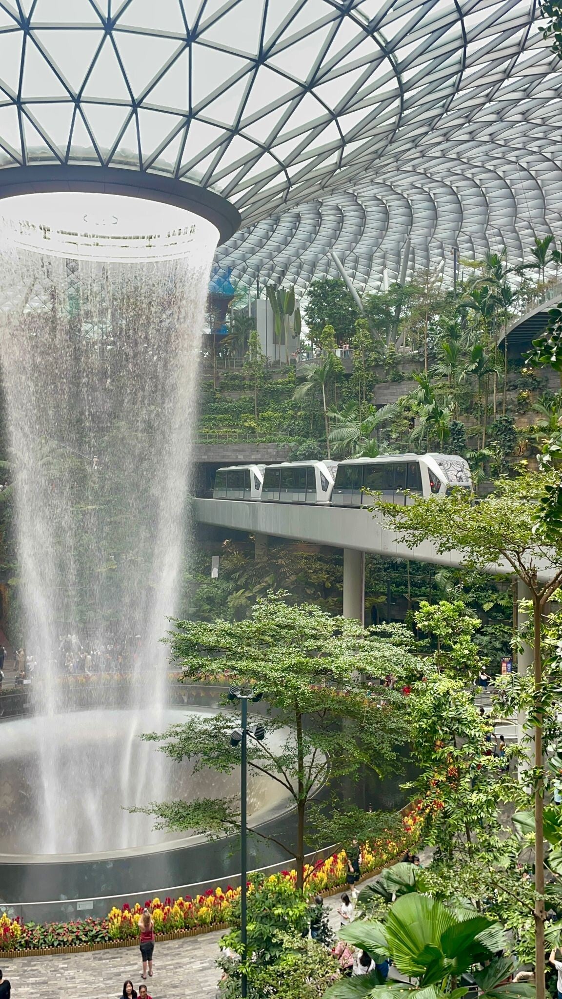 We belanden op Changi Airport. We hebben ons laten wijsmaken dat Aziatische vliegvelden in welvarende steden moderne bolwerken zijn en dat het exemplaar in Singapore een schoolvoorbeeld is van die vooruitlopende technologie en als we besluiten naar ‘Jewel’ te gaan, blijkt dat de moderniteit van het vliegveld geen broodje-aapverhaal is. Het juweel van Singapore is een fabelachtig stukje creativiteit en technologisch vernuft: een koepelvormig winkelcentrum met in het midden een enorme, cilindervormige waterval die vanuit het dak naar beneden stroomt. Het hele gebeuren wordt omringd door keurige, duur uitziende paden gehuld in tropische planten (zowel echt als nep) wat het geheel tot een soort van futuristische botanische tuin maakt. Wat een prachtige plek.