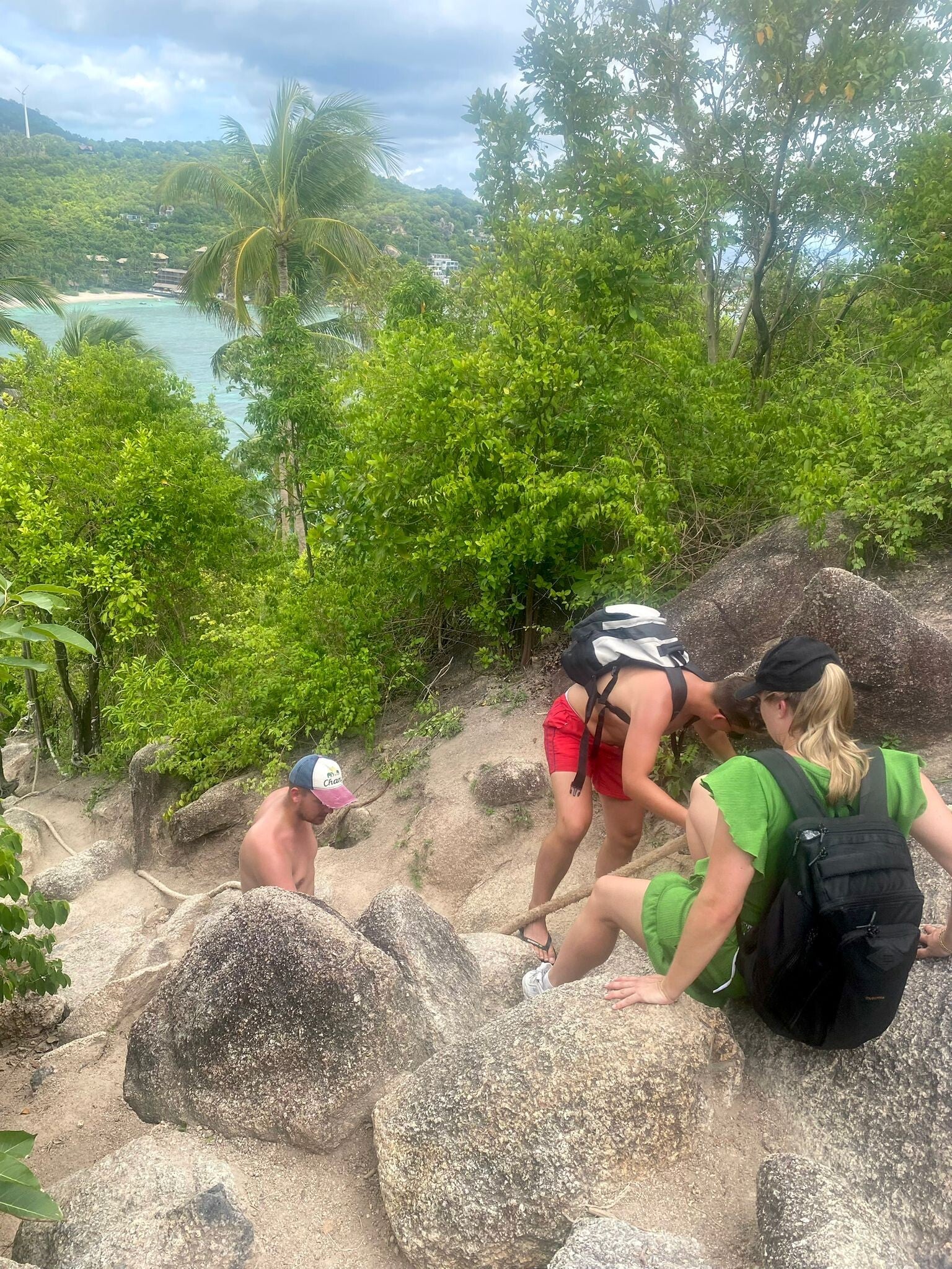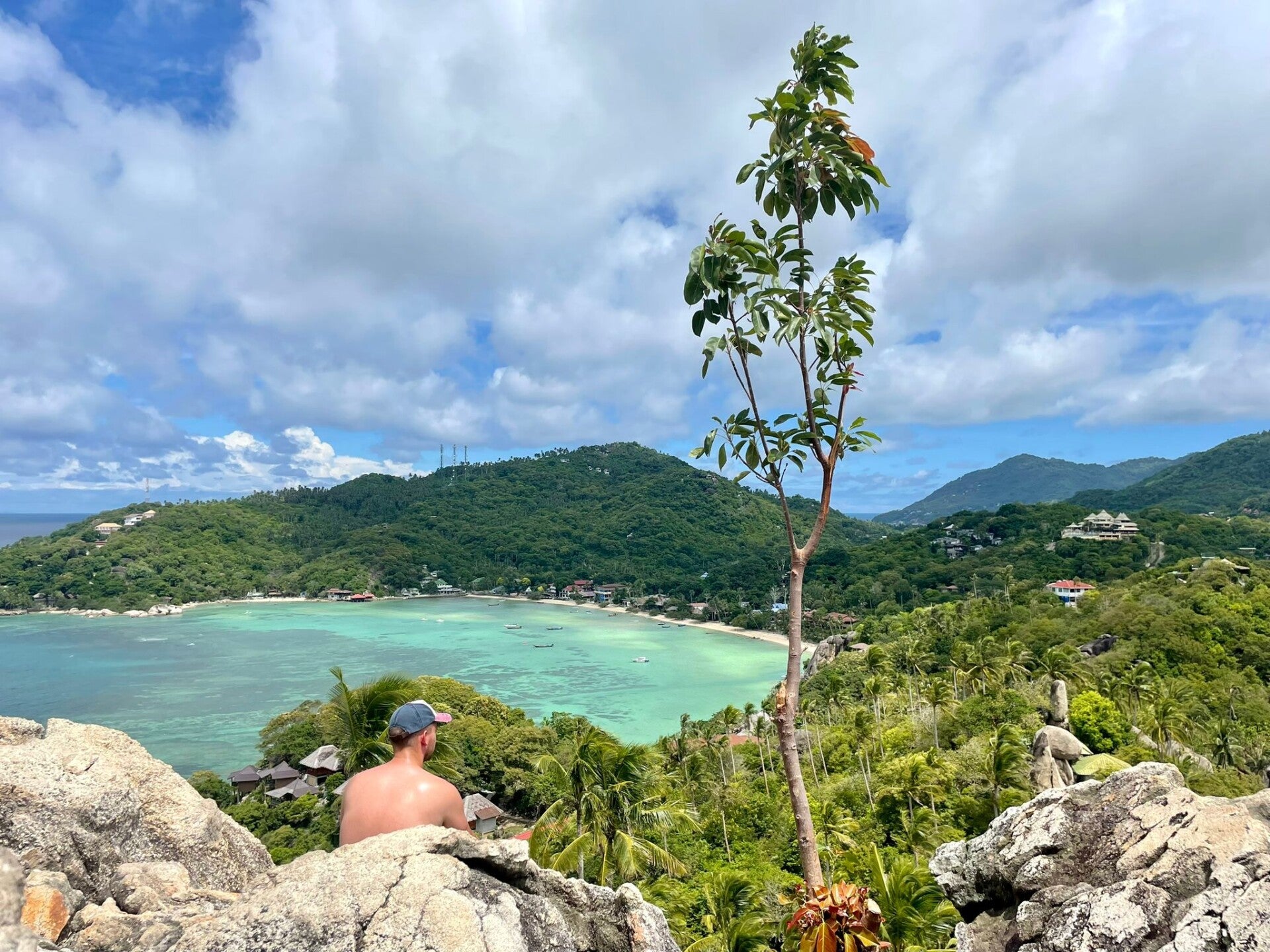 Koh Tao is een klein eiland. Het iets zuidelijker gelegen Koh Samui is bijvoorbeeld groter dan Aruba, dus tropische eilanden in Thailand zijn niet per definitie klein, maar Koh Tao is maar een fractie van die grootte en telt in totaal 21 vierkante kilometers. Je bent dus zo van de ene kant van het eiland naar de andere kant. Onze eerste stop lag in het zuiden van Koh Tao: John Suwan Point. Als je hier komt, is het eigenlijk de bedoeling dat je naar het uitzichtpunt gaat klimmen. John Suwan Point is namelijk een punt op de top van een heuvel waarbij je uitzicht hebt over het hele eiland. De klim ernaartoe is een korte, maar wel een taaie. Er is namelijk geen pad, maar her en der zijn touwen opgehangen om je enig idee te geven van de richting waarin je moet klauteren en volgens ons is dat tien keer mooier dan een wandelpad dat naar boven leidt, want je waant je soms even als een kind in een binnenspeeltuin, alleen dan moet je hier wel even twee keer kijken waar je je voeten neerzet. We zeiden het al in z’n vieren: als deze plek in Nederland had bestaan, was het complete gebied afgesloten geweest totdat er een vlonderpad en een paar driemaal gedubbelcheckte trappen waren aangelegd en er een verplichting was ingevoerd om met helm en knie- en elleboogbeschermers de klim te starten. Hier in Thailand hoef je dat niet te verwachten natuurlijk. Ben je mal? Het uitzicht vanaf de top na een intensieve korte klim (credits aan Bart en Inge, die de schoenen in de buddy van de scooter lieten zitten en de heuvel op slippers probeerden te trotseren) was dan ook des te mooier.
