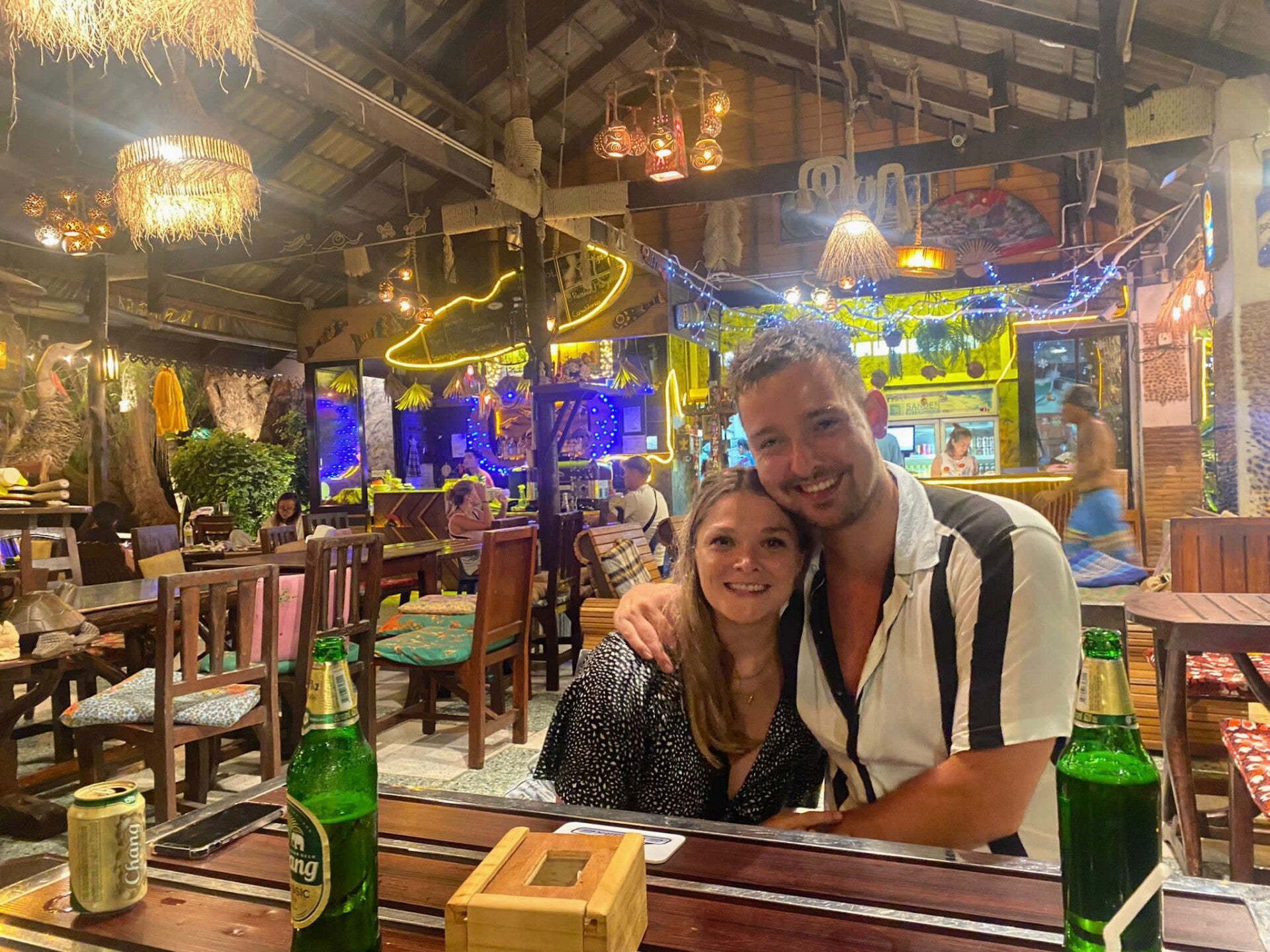 In de avond aten we met z’n vieren bij de Italiaan. Wederom pizza voor mij. Op reis ontdek je altijd eten dat je mist. Thuis was ik nooit zo’n pizzaliefhebber. Lekker, héél lekker, maar niet mijn nummer één op de favorietenlijst. Op reis hunker ik naar die frisbees, heb ik gemerkt. Ook naar frikandellen speciaal, maar die zijn nou eenmaal niet voorhanden, dus dan doe ik het maar met pizza’s. Geertje heeft daar overigens nog niet zo’n last van. We sloten de avond af aan het strand met een spelletje, Bommen en granaten. Nee, we zijn niet van plan de Tweede Wereldoorlog te recreëren, maar dat is dus echt een heel leuk spelletje om de avond mee te vullen. We merkten hier heel erg hoe de Thaise mentaliteit in elkaar steekt. Eindtijd is eindtijd. Rond elf uur ging de muziek uit en tot onze blijdschap kon Bart nog één rondje bestellen en vertelden ze ons dat we mochten blijven zitten, maar een krappe vijf minuten later vlogen de lampen ook uit en zaten we met z’n vieren in het pikkedonker te kijken naar een stel dobbelstenen een paar stapeltjes kaarten. Zo werkt dat hier dus. We mochten in elk geval wel blijven zitten.