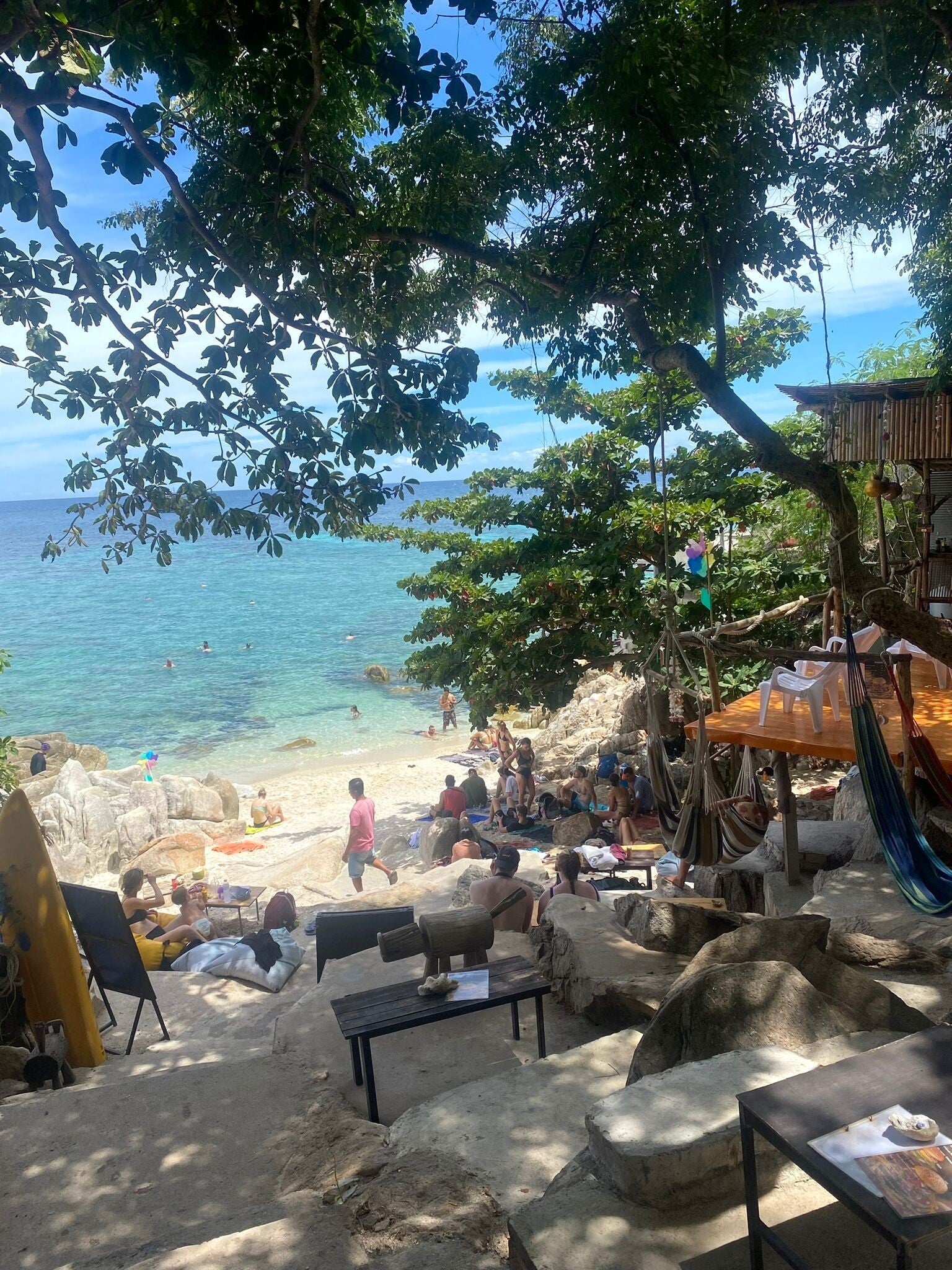 De enige haaien die bestaan rondom Koh Tao, zijn kleine rifhaaien en die zijn in Shark Bay te vinden. Shark Bay is een klein, schilderachtig, maar toch best wel druk strandje aan de kust in het zuidoosten van Koh Tao. Een mooi snorkel- en duikplekje, dus trokken we ons snorkelwaar uit de rugzak om eens een stukje de zee in te zwemmen en wat te snorkelen, maar hoewel het misschien arrogant klinkt, voelt snorkelen nu toch een beetje alsof er na het behalen van je rijbewijs aan je uitgelegd wordt hoe de koppeling werkt en hoe je moet schakelen. Je kent het allemaal wel en je weet hoeveel mooier het kan zijn. Desondanks is het meer dan prima om na die bezwete klim eventjes de verkoeling van het water op te zoeken. We zagen overigens ook geen rifhaaitjes, dus de naam Shark Bay klinkt ook een beetje overdreven, vind je niet? Nou schijnt het zo te zijn dat er vroeger een hele hoop grote haaien (van die echte) in deze wateren zwommen, maar zoals je weet wordt de haaienvinnensoep meer gewaardeerd hoe oostelijker je gaat en is de complete haaienpopulatie in dit gebied dood gevist. Toch wel een beetje triest, maar misschien verklaart dat de naam van dit baaitje.