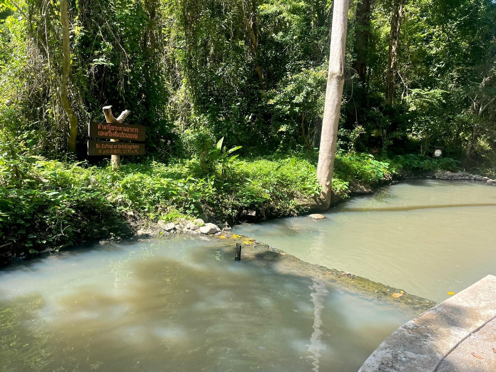 In IJsland waren ze natuurlijk heerlijk, die warmwaterbronnen. -10 buiten en hup die hete baden in. Fantastisch. Bij een tropisch klimaat is dat toch wat… anders. Niet alleen voelt het water nóg heter door de hoge temperatuur buiten de baden, maar waar normaliter een plons lekker verfrissend is, begint het verfrissende nu pas bij het douchen naderhand. Wel is het natuurlijk heel ontspannend en een heel vreemde gewaarwording om in de brandende zon opeens in een hotspring te duiken. Een klein wandelingetje bracht ons naar de oorsprong van deze warmwaterbronnen, waar het water 80 graden was. Afgezet met wat hekwerk natuurlijk, maar ook een bordje dat aangaf dat het verboden was om hier eieren te koken. Eieren koken, wie doet dat nou hier? Wij lachen, maar achteraf bleek dus dat de Thai vaak warmwaterbronnen gebruiken om hun eieren te koken. Nou, hier dus maar even niet.