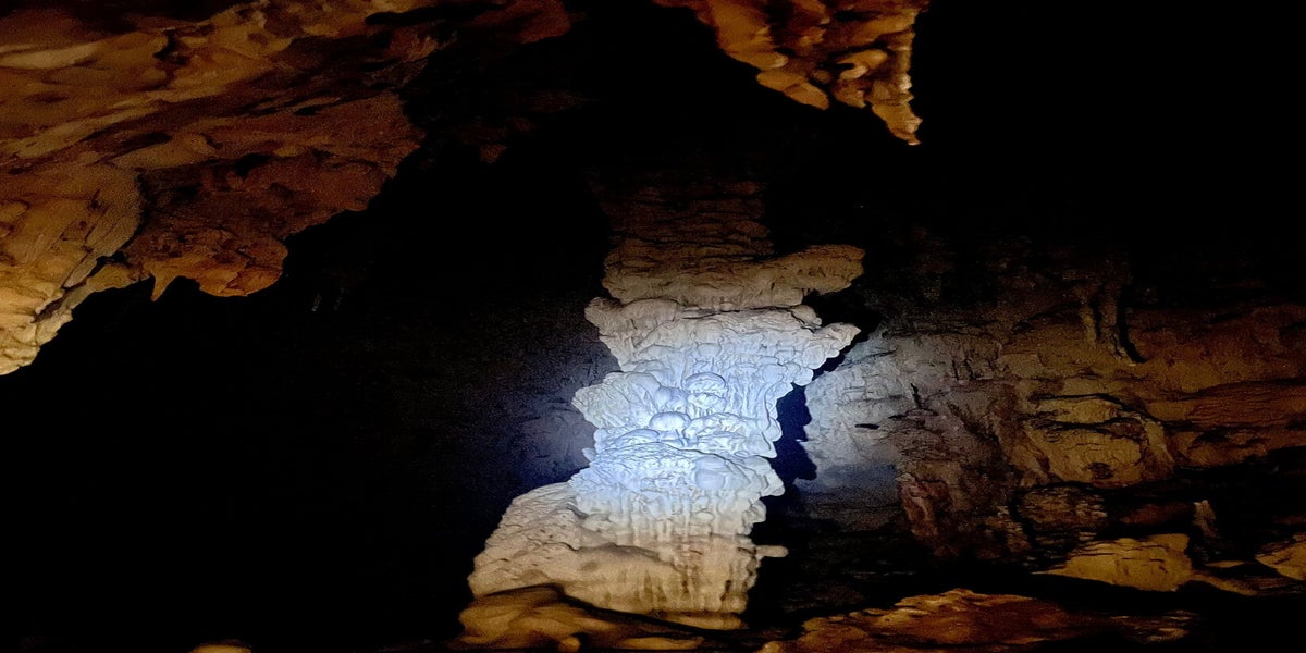 Een halfuur later arriveerden we bij Nam Lod Cave en intussen waren de billen wel behoorlijk houterig geworden van de lange, maar mooie scooterrit. Nam Lod Cave is een grot met drie zijwegen die allemaal verbonden worden middels de Mae Lang rivier die dwars door het grottensysteem heen stroomt. Helaas waren twee van de drie grotten ontoegankelijk als gevolg van de hevige regenval van het afgelopen regenseizoen, maar de ene grot die we in mochten, was wel een heel erg mooie. Onze privégids (een schattig oud vrouwtje die voor de duivel niet bang oogde) had naast ons een gaslampion als enige compagnon en met z’n vieren (de gaslampion incluis) gingen we de grot verkennen.