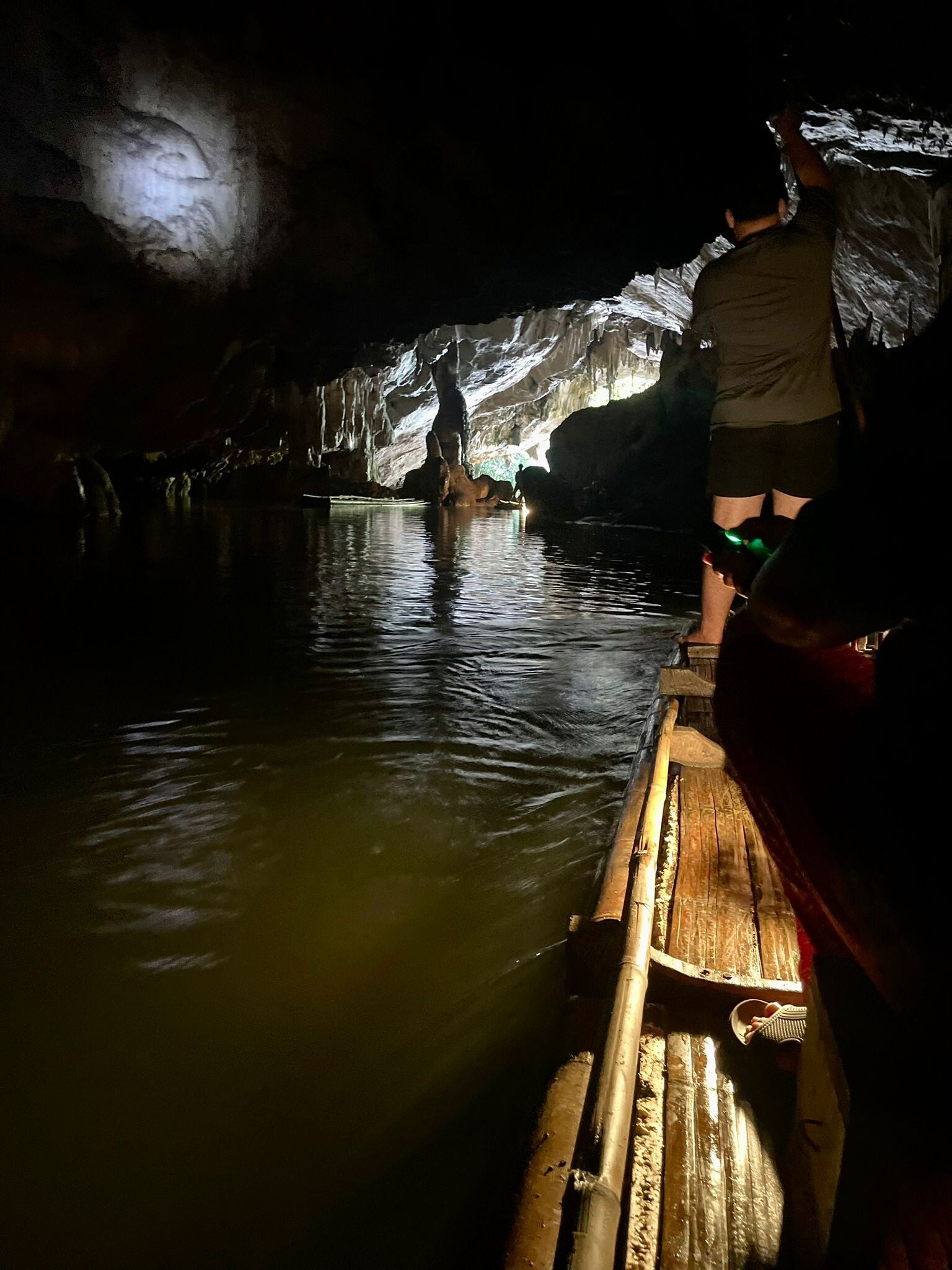 Om bij die eerste (en enige, voor ons vandaag) zijweg te komen, gingen we op een bamboeraft. Dat was wel heel bijzonder. Stel je maar eens een kanovormig bootje van bamboe voor met aan de voorkant zo’n Venetiaanse gondelkapitein en je hebt het plaatje helder hoe we de Nam Lod Cave betraden. Dat voelt als een scène uit de Efteling die tot leven komt. Met het geluid van druppels die ergens in de grot in het water vielen op de achtergrond, voeren we in verdere stilte steeds dieper het duister in, tot op een gegeven moment de enige bron van licht van onze gaslampion kwam. Een magisch en betoverend moment.