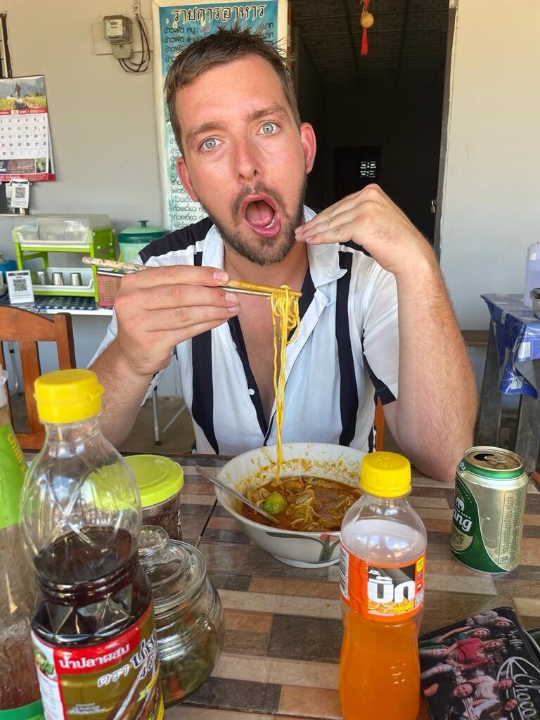Op een gegeven moment gaat er een Thaise jongen van bovenin de twintig zitten. Lange haren, oren waarmee je wereldwijd 5G-bereik hebt, ietwat slonzige kleren en een tenger, slungelig postuur. Echt, voor zo’n jong geef je nog geen rijksdaalder op de vlooienmarkt. De jongen ging zitten, haalden z’n gitaar uit de tas en begon te zingen. De wereld draaide opeens op z’n kop. Wát een ongekend mooi geluid kwam er over zijn lippen heen! We waanden ons plots in Nashville: een zware countrystem en het was alsof een onontdekt wereldtalent voor ons stond op te treden. Nou zijn we niet de grootste muziekkenners (ik al helemaal niet) en heb ik live nog niet zo gek veel meegemaakt, maar ik meen het oprecht: ik denk dat ik live nog nooit iemand zó mooi heb horen zingen. Ik heb Geertje maar even gesommeerd om even een tijdje haar kaken stevig op elkaar geklemd te houden, maar gelukkig vond ze dat deze keer niet zo’n heel groot probleem. Onbekende Thaise meneer: bedankt voor je fantastische zang.