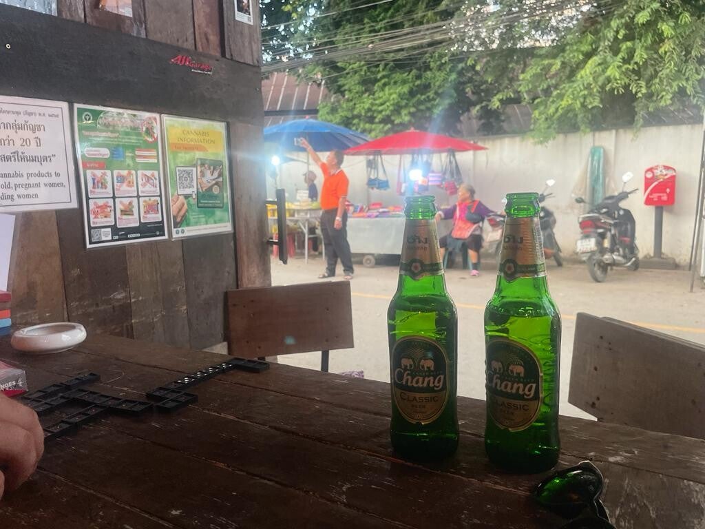 Na een vlekkeloze terugrit kwamen we weer aan in ons hostelletje, zette ik het op een typen en pakte Geertje nog even een massage mee, vlak voor er een joekel van een stortbui op ons neerdaalde. Nét op tijd terug dus! Dit is dus een tropische Thaise bui. Het geeft een beetje Surinamevibes, en zo’n bui is ook wel weer lekker verkoelend. Even later kwam Günther aangelopen. We lachten er een beetje om, in het echt, maar ook in deze blog door hem een naam te geven, maar eigenlijk is het een triest verhaal. Althans, dat gevoel krijgen we. Günther kwam vanuit de kamer waarin hij sliep leplazarus aangestrompeld en aan alles wat op zijn pad kwam, klampte hij zich vast om niet te vallen. “How was your day?” vroeg de man. “Had an amazing day,” zei ik tegen ‘m, waarop hij glimlachte. “How was yours?” Een grommend, niet onvriendelijk maar verdrietig, gegrom volgde, waarop hij zijn weg naar de koelkast vervolgde om er weer een blikje bier uit te halen en slalommend terug naar zijn kamer bewoog. Günther, een Duitse man, getrouwd op drie continenten, slaapt nu in een van de kamers in het guesthouse dat van hem is, terwijl hij niet thuis bij zijn vrouw en kind is en zich ogenschijnlijk dagelijks de vernieling in zuipt. Dat doet je toch wel schuldig voelen over de wijze waarop we eerder om hem lachten. Wijs lesje, je weet nooit wat er zich achter de gordijnen afspeelt.