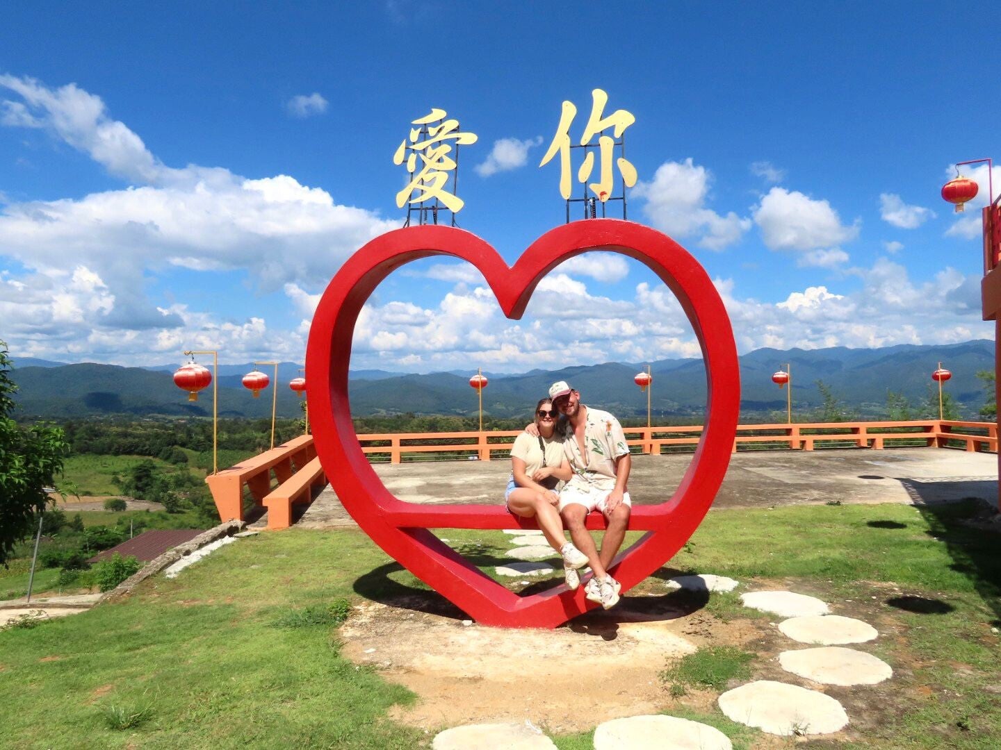 De vierde stop was bij het Yun Lai viewpoint, een kleine tien minuten buiten Pai. Yun Lai viewpoint was een rustig en sereen uitzichtpunt over de Pai vallei aan de andere kant van de witte boeddha (we zagen de witte vlek weer in de verte op de berg), compleet met hartvormig bankje geschikt voor een romantisch kiekje. Even verderop was er ook een plek waar we konden boogschieten. Geertje had dat nog nooit gedaan dus dat wilden we wel eens proberen. De Thai die ons voor een paar baht zes keer op zo’n doel liet schieten, sprak twee woorden Engels: ‘like’ en ‘this’. Die woorden gebruikte hij continu in die volgorde wanneer hij voordat hoe je moest boogschieten en bij potverdorie elke keer schoot die man recht in de roos, waar Geertjes eerste schot nog in het onkruid tussen doel en balie sneuvelde. Er loopt hier dus een onontdekt boogschutterstalent rond, ergens in het Thaise noorden. Waren we nog in de tijd van jagers en verzamelaars geweest, dan had deze man elke avond hoogstpersoonlijk voor een viergangendiner op tafel gezorgd.