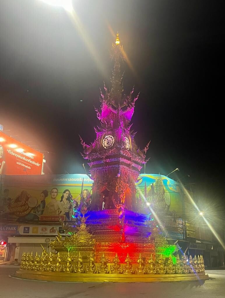 We relaxten nog even bij ons guesthouse (Chian - zonder g – Guesthouse) door in het zwembad te plonsen, informeerden het thuisfront nog even over onze huidige staat van zijn en pakten een taxi naar het centrum voor het een heerlijke Westerse maaltijd om, vooral voor Geertje, de nare smaak van onze late lunch weg te spoelen. Daarna bezochten we de clock tower in hartje Chiang Rai, nog zo’n bouwwerk dat – en ditmaal kunnen we dat wel bevestigen – door onze Thawan is ontworpen. Je raadt het al, de clock tower bevat een klok en vormt het middelpunt van een rotonde en deze gouden klokkentoren (hoewel ‘toren’ een ietwat pompeuzer beeld schetst dan de daadwerkelijke hoogte van het bouwwerk) is ook weer zo’n prachtig gedetailleerd kunstwerk dat in stijl veel weg heeft van de tempels eerder vandaag. Iedere dag om 19.00, 20.00 en 21.00 is er tien minuten durend licht- en muziekvoorstellinkje en laten we om drie minuten voor acht nou net op de rotonde arriveren. Het was heerlijk aimabel en romantisch om aan de rand van de weg te zitten en naar muziek te luisteren en de verschillende kleuren die de gouden toren belichtten te bekijken. We sloten de avond af in een Irish Pub onder het genot van Brighton tegen Liverpool, waarvan die laatste de enige club van mijn favoriete (mijn eigen club meegerekend) is die dit weekend überhaupt een puntje in de wacht heeft weten te slepen. Qua voetbalresultaten loopt het op reis allemaal nog niet zo gesmeerd.