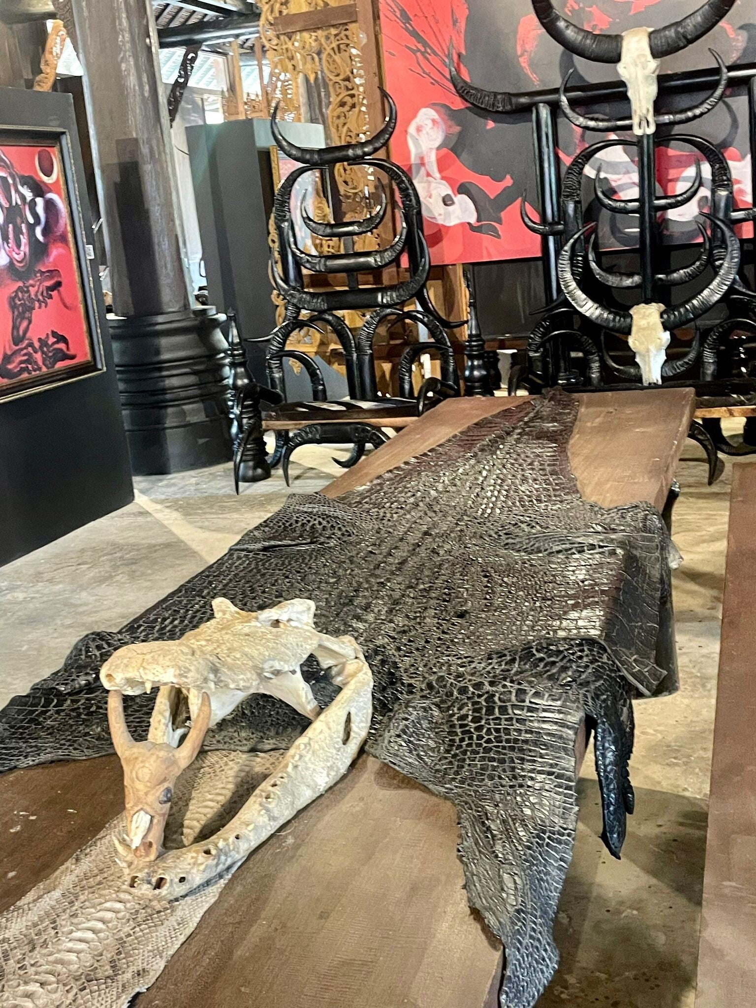 Goed, het Baan Dam museum zelf. Zoals ik al zei, lijkt het alsof er een soort van middelvinger opgestoken wordt naar alles wat heilig is. Zeker weten doen we het niet, want tempels en musea vertonen een chronisch gebrek aan vertaalde informatie, wat wel jammer is, en alleen bovenstaande informatie stond hier in het Engels beschreven. De eerste hal die we binnen liepen, was meteen de belangrijkste. Een bruinzwart gebouw, gedecoreerd met veel te grote zwarte stierenhoorns gaf al een idee van wat er ons te wachten zou staan. Binnen waren hoornen stoelen te vinden en tafels gedecoreerd met wolven- en krokodillenhuiden. Het leek wel een decor van een horrorfilm. Ook waren er talloze obscure, duistere, demonische schilderijen met duivels, slangen en allerlei andere wezens die alleen in een of andere onderwereld op hun plek zijn. Naast die schilderijen hingen QR-codes die je kon scannen (duh, daar zijn ze voor), waarna je een filter op je telefoon kreeg en zodra je dat filter voor zo’n schilderij hield, begon dat schilderij te bewegen. Wij lachen en daar hebben we met de verschillende schilderijen die er hingen toch zeker een dik kwartier domme onderbroekenlol van gehad. Over het terrein lagen geraamtes van dieren verspreid en vooral heel veel huisjes die heel erg Afrikaans aandeden, maar dan op een duistere manier, met veel donkerbruin en zwart en vooral heel erg veel botten, botten en nog eens botten. Je kijkt je ogen uit hier. Na bijna anderhalf uur rondgestruind te hebben, besloten we naar de volgende stop te gaan. Unaniem waren we het erover eens: onze favoriet was toch de houten kobold met een fier rechtopstaand mannelijk voortplantingsorgaan. Heel bijzonder, maar wel slecht voor het masculiene zelfbeeld van iedere man ooit.