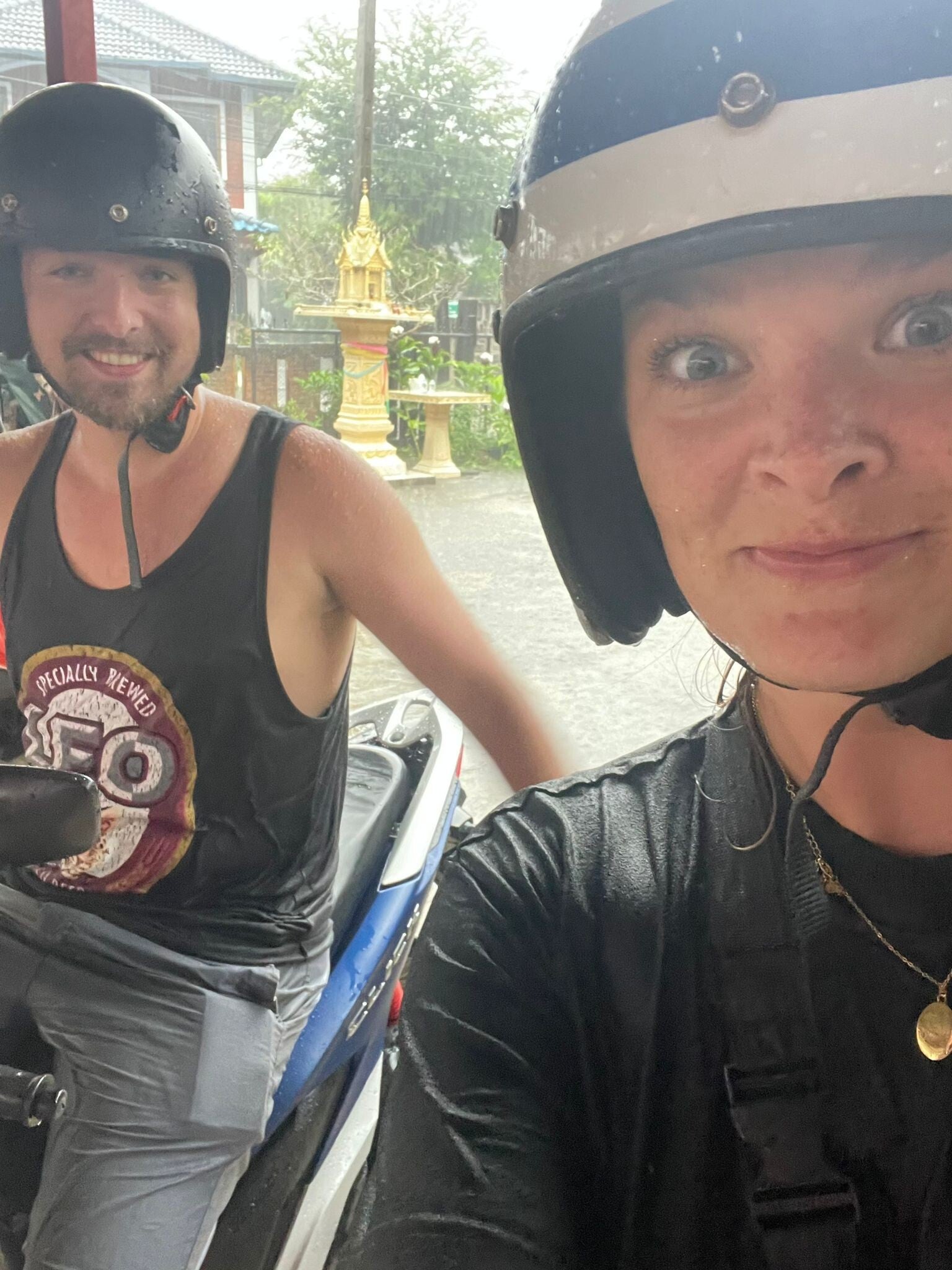 Afijn, de tweede partij theeplantages waren toch wel het hoogtepunt van de dag. Het dieptepunt volgde niet veel later. Ik wilde nog graag naar Long Neck Village (dat bergvolkje met lange nekken) aan de andere kant van de stad, hoewel ik dat nog niet met Geertje besproken had, maar zodra we drie minuten op de scooter zaten, werd duidelijk dat bespreken niet meer aan de orde was. Het begon te regenen. En niet zomaar te regenen, het begon te storten zoals nooit tevoren. Vijfentwintig minuten zou het duren voordat we überhaupt al thuis zouden zijn en voordat we een plek vonden om effectief te schuilen, waren we al helemaal doorweekt. En met stortregen bedoel ik stortregen. Een constante diarree van God boven de wolken en zo’n regen als deze heb ik voor het laatst in Suriname meegemaakt. Het werd niet minder. De laatste drie minuten voor we thuis waren, zag je, als je recht vooruitkeek, meer water dan Chiang Rai. Bizar. Eenmaal thuisgekomen keek de eigenaar van ons lacherig aan: “oeh, oeh, rain, rain,” hinnikte hij, zichtbaar onder de indruk van zijn eigen grap. Hoe kon hij dat nou weten. Als we in het zwembad gesprongen waren met kleren aan, hadden we er hetzelfde uitgezien.