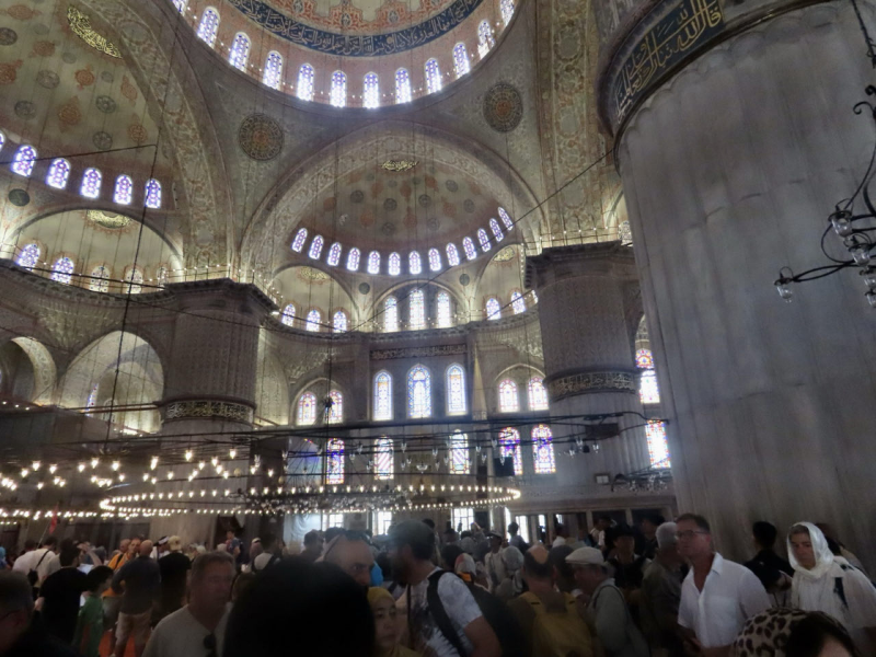 En dat doen we. We nemen een koffietje bij dezelfde koffietent als waar we een dag eerder koffie dronken, waar ik 'like a local' aan de Turkse koffie ga en Geertje al bij het ochtendgloren toegeeft aan de hitte en voor een ijskoffie kiest. We vervolgen onze route en staan weer op het Sultanahmetplein en binnen tien minuten staan we weer tussen die twee moskeereuzen: de Ayasofya en de Blauwe Moskee. Hoewel die eerste historisch meer waarde heeft de bekendere is van de twee moskees, kiezen we er toch voor om de Ayasofya links te laten liggen en de Blauwe Moskee in te gaan. Er is zó ontzettend veel te doen en te zien in Istanbul, dat we voor één van de twee in plaats van beide kiezen. Waarom de Blauwe Moskee? Mooier van buiten en gratis entree. Oh ja, en zodra Geertje iets blauws ziet, is ze tot over haar oren verliefd. De Blauwe Moskee dus en een teleurstelling krijgen we niet.