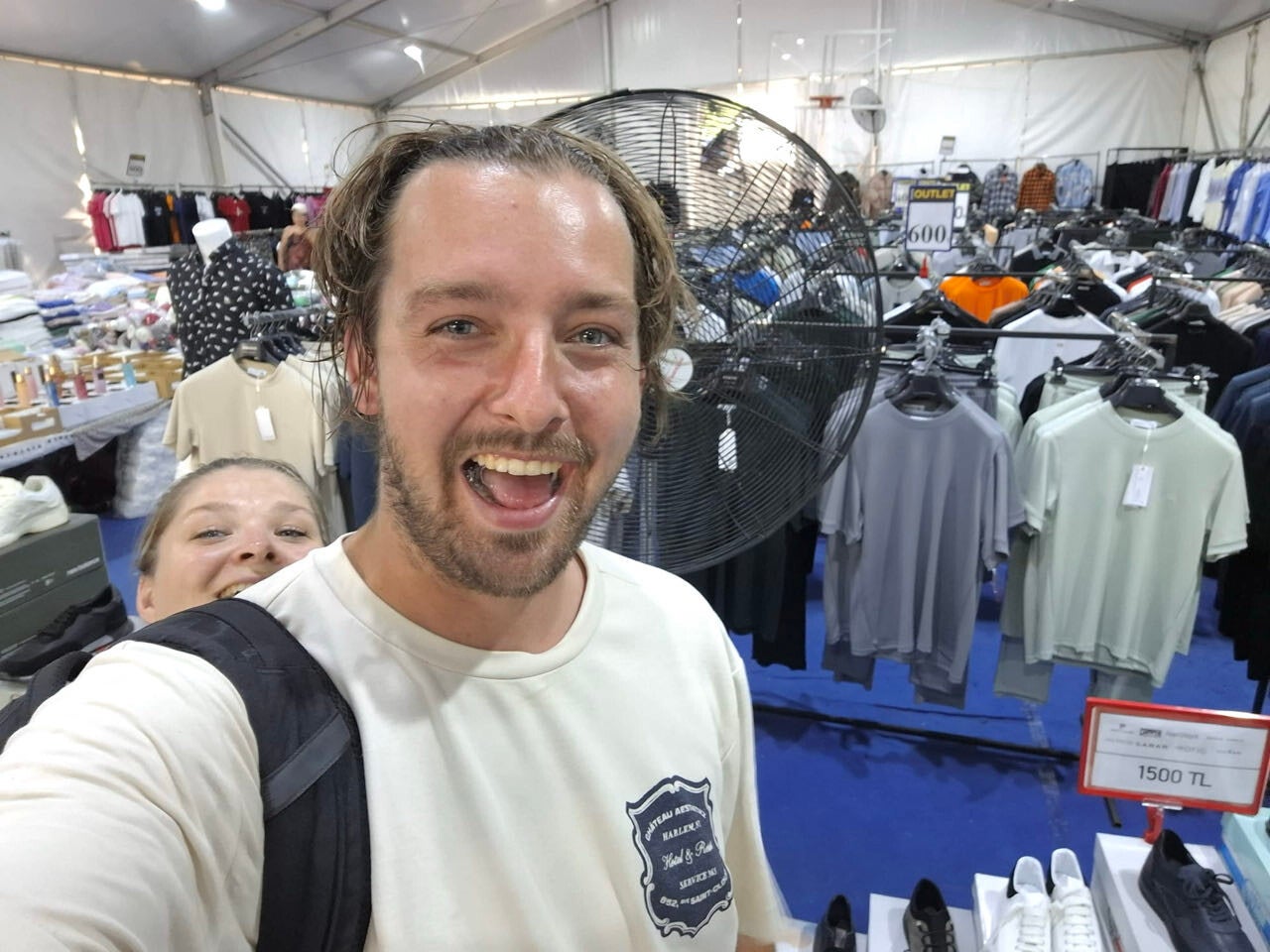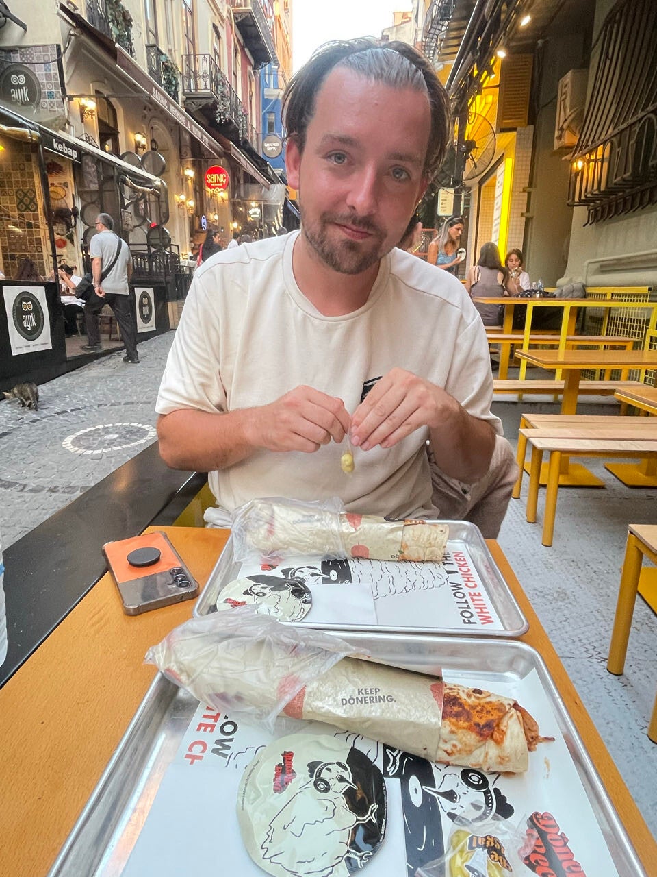 Maar ook aan deze middag komt een einde. Als het tegen zessen loopt, lopen we naar de restaurants en winkelstraten van Kadiköy. We komen langs een grote gelegenheidstent waar je duizenden nepschoenen op de kop kan tikken. We kopen niks, maar genieten wel even van de ventilatoren. Je moet wat, met zulke temperaturen. We nestelen ons nog even in een Irish Pub, alvorens we onszelf trakteren op de ALLERLEKKERSTE DÜRÜM DÖNER die we ooit gegeten hebben, zoals alleen de Turken ze kunnen maken. En dat voor nog geen 8 euro. Niet eens per persoon, maar in totaal!