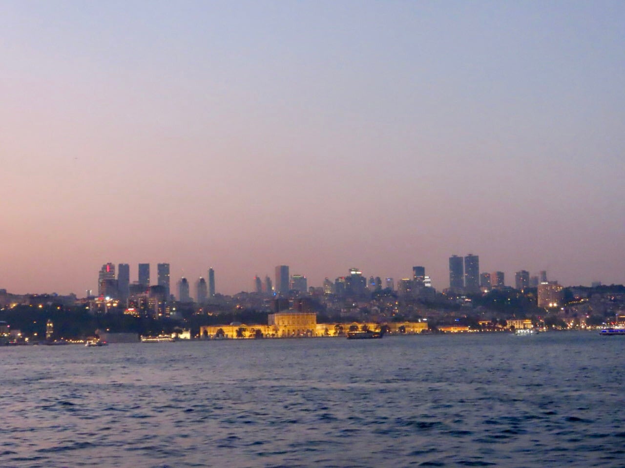 Even later maken we onszelf uit de voeten, terug naar Sultanahmet. Niet met de trein deze keer, maar met de veerboot die in een klein uurtje de Bosporus oversteekt, terug naar Europa. De Ayasofya en de Blauwe Moskee geven licht in de verte. Nog meer enorme moskeeën waarvan we de namen niet weten lichten ook op, terwijl het steeds donkerder wordt. De Bosporusbrug, de brug tussen twee werelddelen, licht ook op, zoals hij dat twee dagen eerder tijdens de cruise ook deed. Heel Istanbul licht op. Hier, op de ferry voelen we de magie. De magie van deze stad en de historie die er voelbaar is. Istanbul is prachtig.