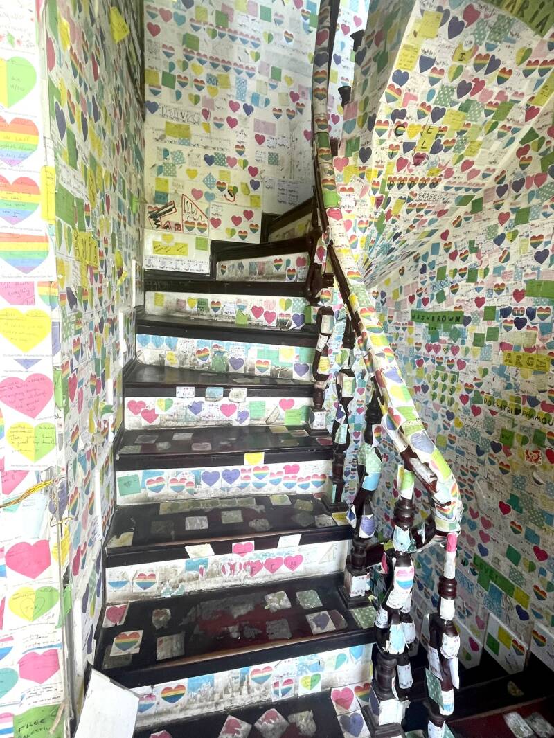 We vervolgen onze weg naar het Note Café. Of Note Café gemetseld of getimmerd is, of dat het misschien gewoon een groot origamikunstwerk is, is een staatsgeheim, want alle wanden van dit pand van vier verdiepingen hoog zijn compleet gehuld in post-its. Naar we denken zijn er miljoenen blaadjes die de wanden, lampen, stoelen en tafels versieren en iedere bezoeker van het Note Café (door Geertje het hartjescafé genoemd) krijgt een post-it om aan het repertoir toe te voegen. Echt een café dat afkomstig lijkt uit een sprookje en absoluut een aanrader om hier jezelf even van een bakkie pleur te voorzien. Als blijkt dat er geen plek is in het café te vinden is waar geen sticker op zit, besluit ik de post-it die aan mijn moedertje gericht is tactvol over een post-it te plakken waar alleen de tekst ‘Feyenoord’ op staat. Geertje kiest een leuk plekje uit voor het kaartje gericht aan haar jongste broertje Jarno (lief) en Manon en Anandi plakken de post-its gericht aan elkaar ook naast elkaar op de muur naast ons tafeltje. Wat lief! Anandi vindt het heel leuk om drie maanden met Manon te reizen. Wat jammer dat Manon hetzelfde niet weet te zeggen over Anandi.