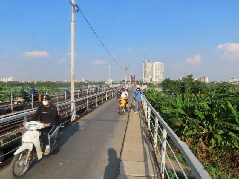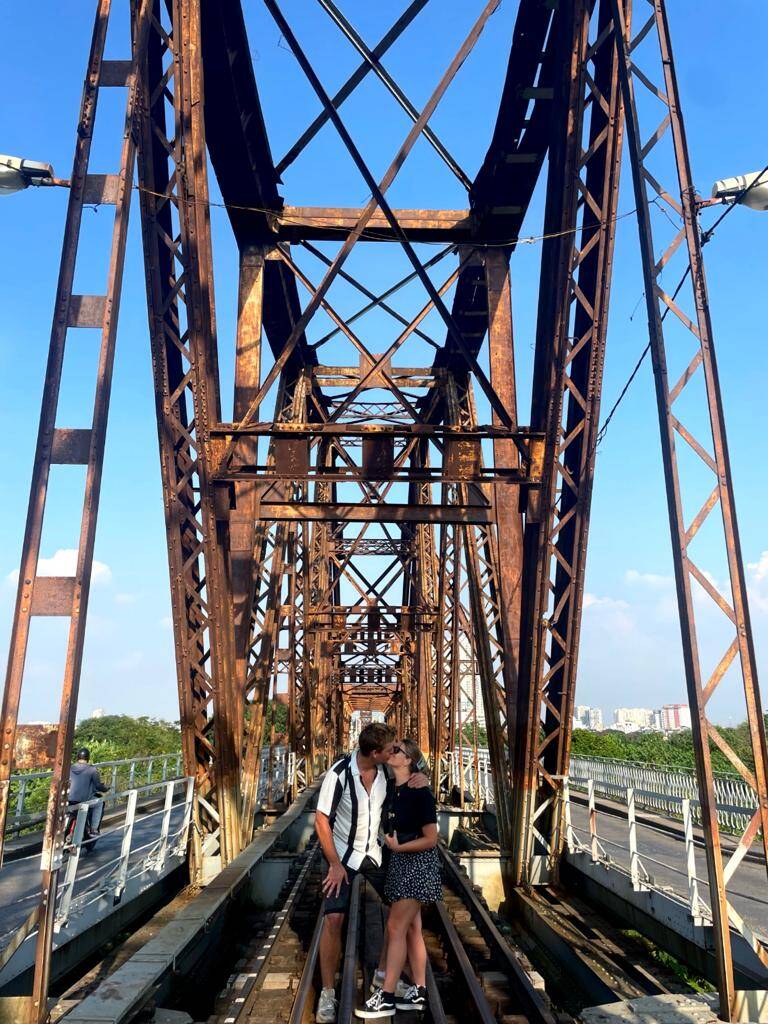 Niet veel verder ligt de Long Biên Bridge, een spoorbrug wier skelet wat wegheeft van het fundament van de Eiffeltoren. Het is tevens een lang bruggetje hoor, die Long Biên Bridge. Bryan stelt voor om erop te klimmen om weer aan paar foto’s te maken en dat zijn weer heuse pareltjes geworden, dus daar zijn we ‘m dankbaar voor, maar zodra we klaar zijn met onze fotoshoot zien we in de verte een trein aan komen denderen en dan begint het besef opeens wat je zojuist gedaan hebt. In Nederland is dit natuurlijk onmogelijk: je klimt een treinspoor op, gaat daar met vijf man doen alsof je op een catwalk loopt (alles voor de Insta), in de verte komt een trein in zicht en geen van de honderden – misschien wel duizenden – scooters die in de tussentijd over de scooterpaden langs de brug rijden, kijkt vreemd op dat er een stel witte dorpsgekken met een Vietnamees het spoor tot hun podium omtoveren. In Nederland had hier meteen een politiekorps aan de kant gestaan.