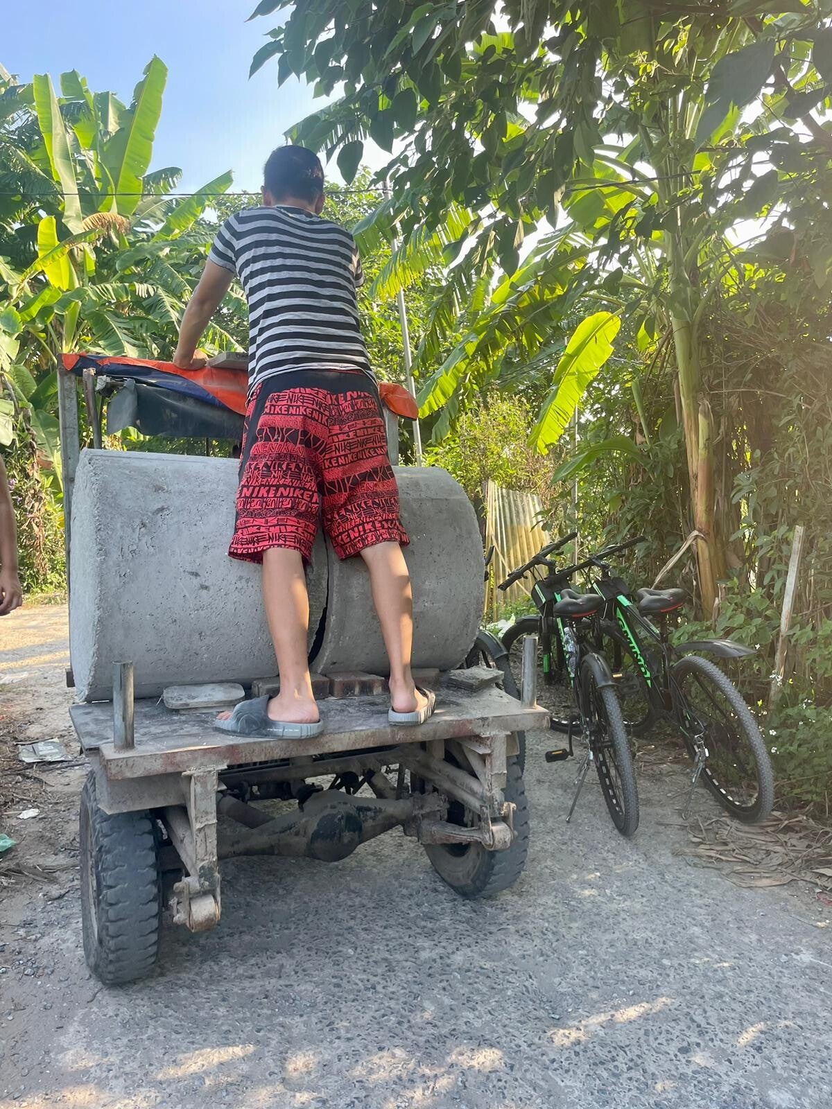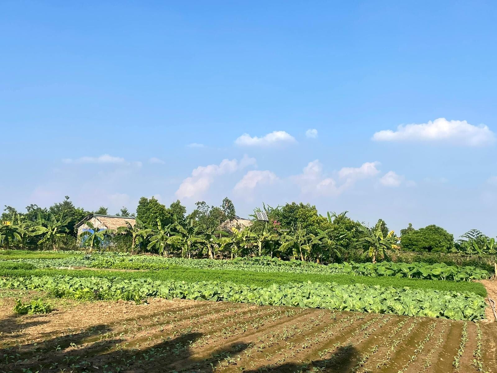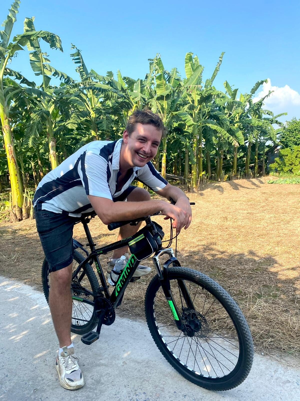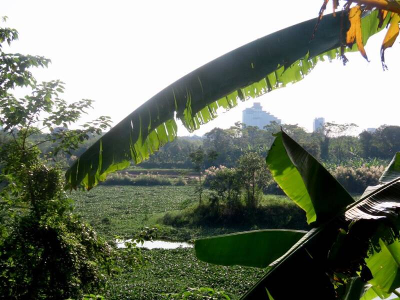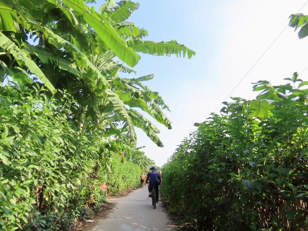 Hierna fietsen we naar Banana Island. In Hanoi zijn ze echt goed met namen bedenken die perfect weergeven wat er met een plek bedoeld wordt. Train street (straat met een trein), Beer street (straat met heel veel bier), West Lake (het westelijke meer), Note Café (een café met allemaal post-its) en nu dus Banana Island: een eiland met bananenbomen. Functionaliteit, noemen we dat. Wel een heel mooi en heel bijzonder eiland. Banana Island ligt midden in de stad en is een soort bananenbomenboerderij (wat allitereert dat lekker, zeg) waar we ook nog veel locals aan het werk zien. Het eiland is best groot en het bijzondere is dat je in alle windrichtingen van het eiland kunt kijken en je altijd de stad Hanoi boven de bomen uit ziet torenen. Meteen doemde de vraag op waarom dit deel dan in godsnaam niet bebouwd is, maar dat is dus omdat de grond op dit eiland enorm zacht is en niet geschikt is om grote gebouwen op te zetten en het resultaat is dus dat hier een prachtig stuk gerepte natuur (het is ten slotte een soort van landbouwgrond) midden in de stad te vinden is.