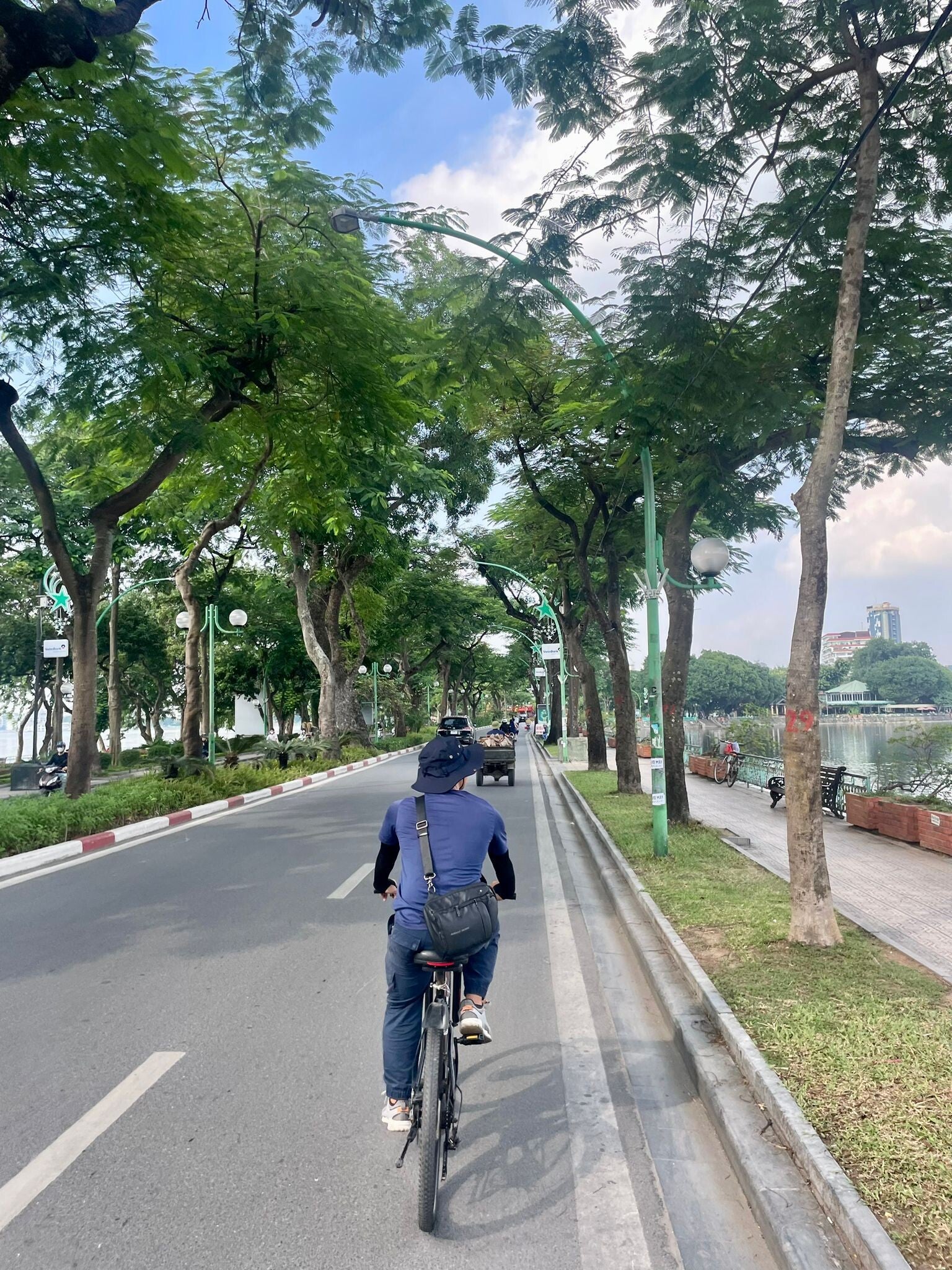 We fietsen langs het West Lake, een prachtig meer midden in Hanoi met prachtige uitzichten over de hoogbouw van de Vietnamese hoofdstad in de verte. Als je van skylines houdt, dan is dit plekje wel een mooie. We observeren een paar vissers en wat bootjes die dobberen op het water. Bovendien ontdekken we Bryans hobby én verborgen talent al meteen: foto's maken. Vanuit alle hoeken en met nog meer poses weet hij op iedere plek de leukste foto's te maken. Een vaardigheid die we maar al te graag uit willen buiten.