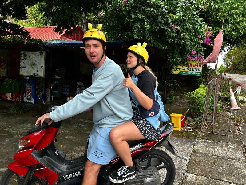 Het kan ook in Vietnam blijkbaar niet gek genoeg. Ik had het nog niet gezien op de foto, maar de Picachu helmen zijn echt grandioos, en dan al helemaal met het shirt Oké. Doei. daar weer onder :)