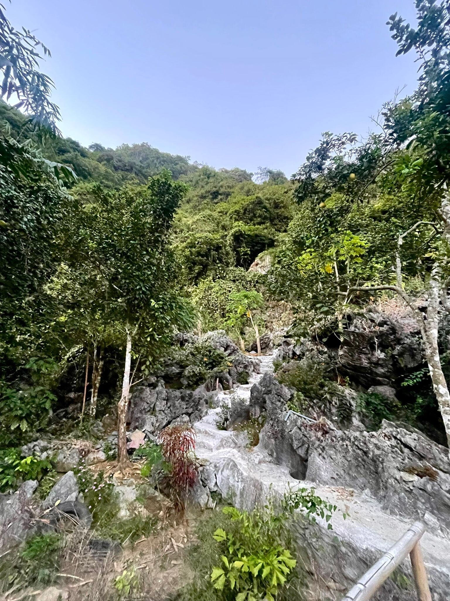 Cat Ba National Park: the Main Event of the Afternoon. Een kilometertje verder beklimmen we – alvorens we Linn plotsklaps tegen het lijf lopen – een berg in het Cat Ba National Park. Blijkt toch wel een pittig klimmetje te zijn: een halfuur lang is het op enkele meters na louter bergop. Met activiteiten als deze is het ontbreken van de tropische zon dan weer niet zo erg, want zelfs zonder die zon is het zweten geblazen en staan de kuiten na het bereiken van de top op hoogspanning. Op de top is het weliswaar druk, maar de 360-gradenuitzichten zijn het meer dan waard.