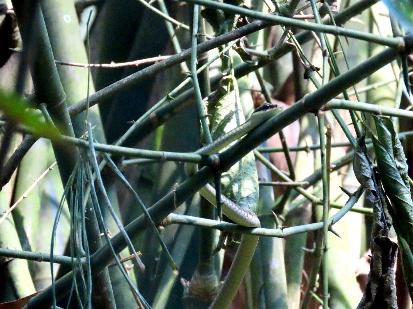 Dan zetten we koers naar de vogelspotspot, de spot waar vogels te spotten zijn. Maar voor we ook maar één vogel gezien hebben, hoort Geertje op het dichtbegroeide pad naar die plek toe geritsel rechts van haar. “Een slang!” zegt ze. Ze ziet hem niet, maar ze herkent het geluid, beweert ze. Ik sceptisch, natuurlijk, maar blijkbaar heeft Geertje zich de afgelopen maanden tot een ware Jane ontpopt en nauwelijks anderhalve meter van ons vandaan, kruipt een bruine, goed gecamoufleerde slang zich elegant een weg langs de bamboestelen naar boven. Een beetje beangstigend, een wilde slang van zo dichtbij, maar ook bijzonder, ontzagwekkend en fascinerend. Geertje, houd je oren vanaf nu maar mooi gespitst.