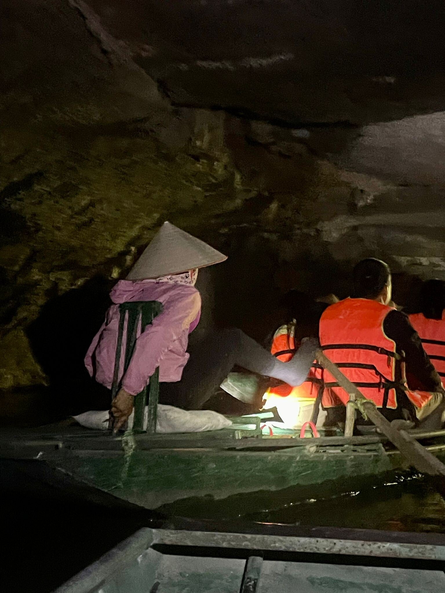 We kunnen kiezen uit drie routes en op aanraden van een medetoerist, die we zonder aantoonbare reden verheffen tot alwetende Trang-Anexpert alsof ze alle routes driemaal daags vaart, kiezen we route 3 en stappen we op een van de bamboebootjes. We moeten een afzichtelijk oranje reddingsvest aan (er staat hier praktisch geen stroming en het water lijkt nog geen twee meter diep te zijn, maar ach, protocol, dus ja) en nemen plaats voor een vrouw die onze roeister van vandaag is en die in Nederland wellicht al de pensioengerechtigde leeftijd behaald zou kunnen hebben. Best bijzonder: wij als jonge twintigers laten een oud vrouwtje drie uur lang voor ons peddelen. Als we om ons heen kijken, zien we dat een leeftijd van boven de zestig en het bezitten van het vrouwelijk geslacht bijna twee knock-outcriteria lijken bij de sollicitatie voor roei(st)er op de Trang An, want van de honderden roeiers is het aantal roeiers dat niet aan tenminste één van die twee criteria voldoet op één hand te tellen. Gelukkig heeft de boot één speelgoedroeispaantje per persoon op voorraad, maar die zijn niet van bijster hoge kwaliteit. Bij de Decathlon zouden ze gratis van de hand gedaan worden en bij Bart Smit zou je bij een aankoop van tenminste vijf euro twee van dit soort exemplaren cadeau krijgen. Als we het oude vrouwtje helpen met peddelen, is het ook een beetje alsof je een kind van drie in zo’n autootje in de draaimolen zet. Hij stuurt zichzelf een ongeluk, maar dat autootje zal altijd op z’n plek blijven staan. Evenals die roeispanen: hoe hard we ook peddelen, ze helpen ons geen meter vooruit.