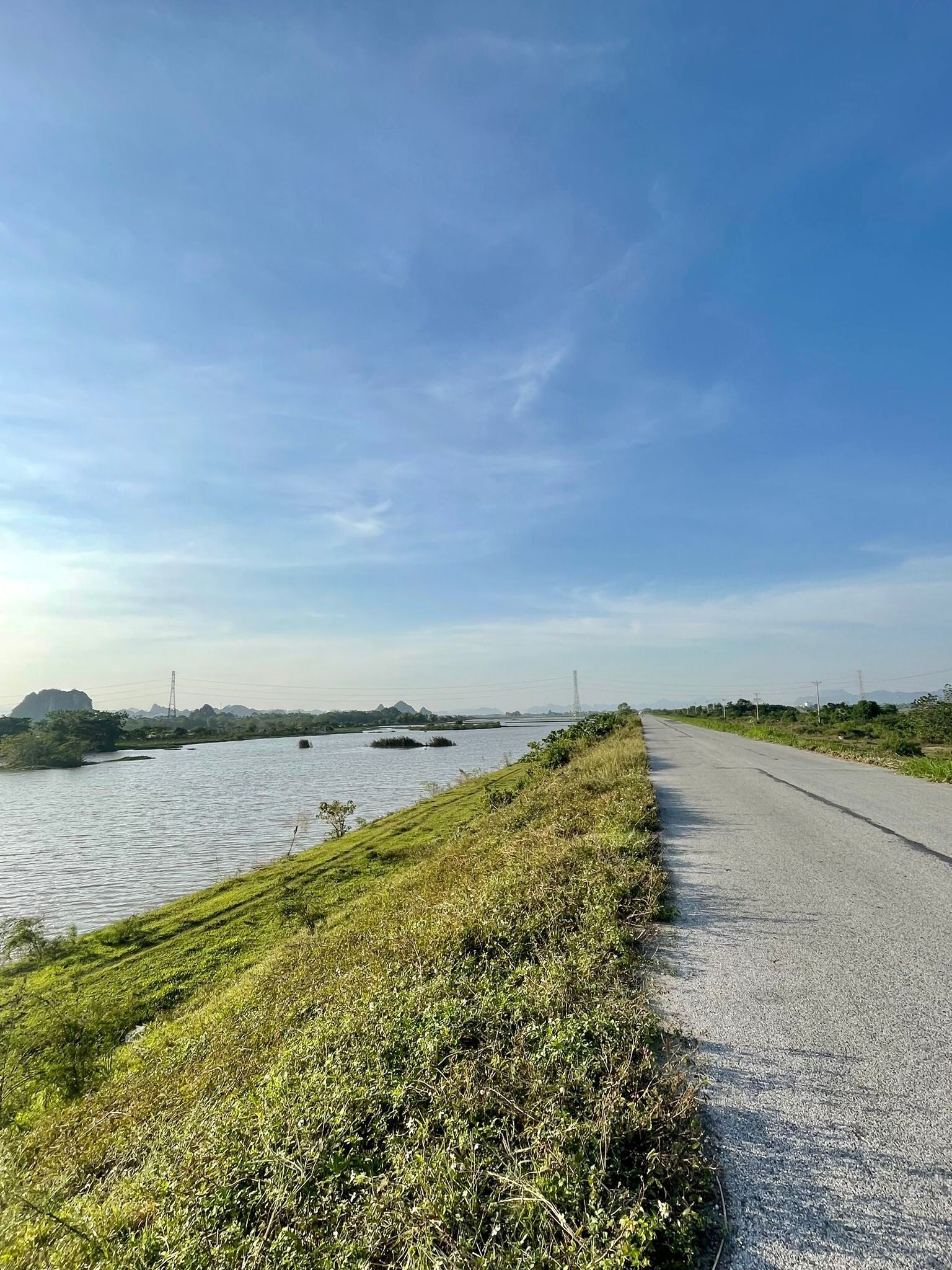 Wat is de omgeving hier prachtig. Dezelfde rotsformaties als in Ha Long Bay schieten hier ook weer als paddenstoelen uit de grond. De rest van de omgeving wordt gekenmerkt door rijstvelden, maar omdat het oogstseizoen al lang en breed ten einde is, lijken de velden allemaal polders en waan je je, als je de karstbergen, de vele kleine tempeltjes en de kraampjes aan de kant van de straat wegdenkt, gewoon weer in Nederland. Zeker die grauwe, grijze lucht draagt daar een behoorlijk steentje aan bij. Bovendien is Vietnam eigenlijk heel vlak. Vietnam wekt bij veel mensen het beeld op van een bergachtige jungle, maar dat is eigenlijk wat Laos is en afgezien van de gebieden in het noorden (Sa Pa, Ha Giang; dat soort plekken) nabij de Chinese en Laotiaanse landsgrenzen, is Vietnam eigenlijk zo plat als een pannenkoek waar je veel te dikke tante net iets te lang op gezeten heeft.