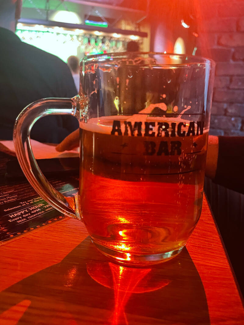Typisch IJslands strandden we in The American Bar, een onwijs gezellig burgerrestaurant in jaren ’80-stijl (of ’70, geef het beestje een naam), aangekleed met kentekenplaten van verschillende staten, langspeelplaten en schilderijen bestaande uit pakkende Amerikaanse teksten. Het zou een dure avond worden, want later zou de halve finale van de Champions League tussen Liverpool en Villareal (natuurlijk wint Liverpool) uitgezonden worden op zo’n 15 van de 25 aanwezige schermen, vergezeld door een heus leger aan Liverpoolfans. En het vooroordeel is waar: bier in IJsland IS heel duur! We betaalden van 4 tot 7 tijdens happy hour omgerekend 6,50 voor een biertje, en daarna was 10 euro goedkoop geweest. Het resultaat was een flinke rekening die de ober, de ober die ons dus wist te vertellen dat hij van 2017 tot 2019 werkzaam was bij de Chinees in, of all places, Malden! Over een klein wereldje gesproken… tot korting heeft het helaas niet geleid.