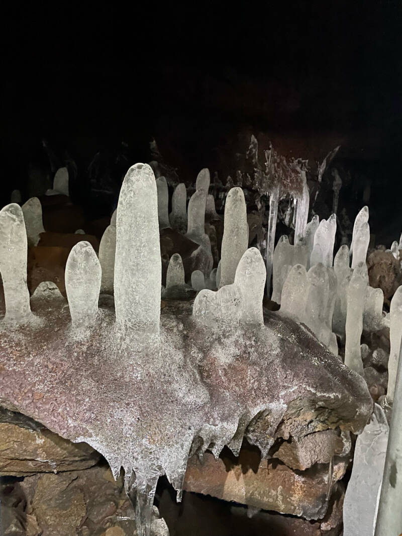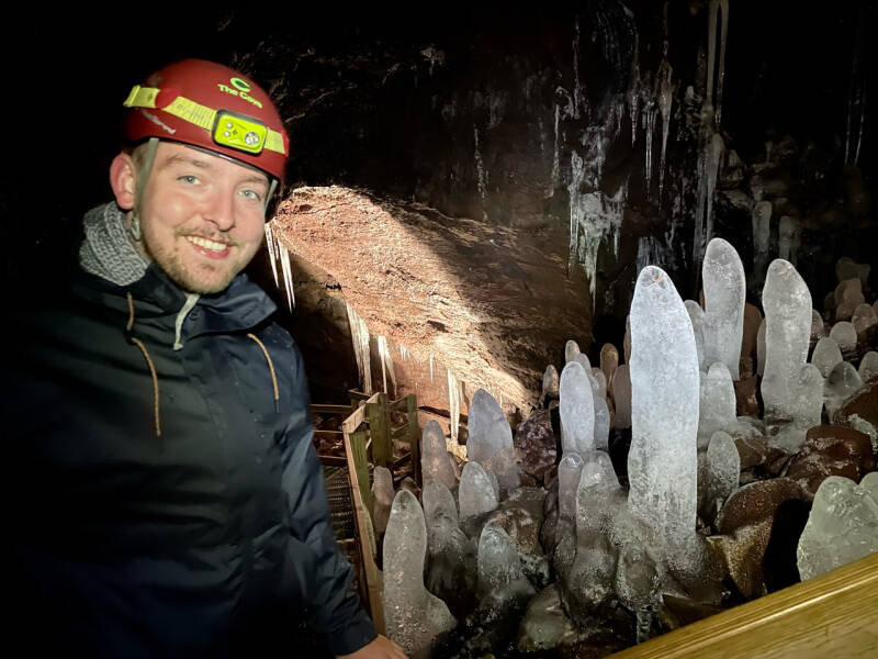 Het mooiste van alles waren de stalagmieten van ijs. Die zijn in IJsland behoorlijk normaal in grotten, maar wereldwijd vind je ze nergens. Dat heeft te maken met twee luchtstromen. We begrepen het niet helemaal, maar door Vidgelmir stromen twee luchtstromen, één onder en één boven. De bovenste is behoorlijk warm, waardoor het water naar beneden drupt. Wanneer het water op de stenen kletst, belandt het in de tweede, de koude, luchtstroom en bevriest het meteen. Hierdoor druppelen maandenlang druppels op elkaar die elkaar bevriezen en waardoor er prachtige ijssculpturen ontstaan. Bij het begin van de lente beginnen ze ook weer tergend langzaam te ontdooien en de herfst start het hele proces opnieuw. Magisch mooi.