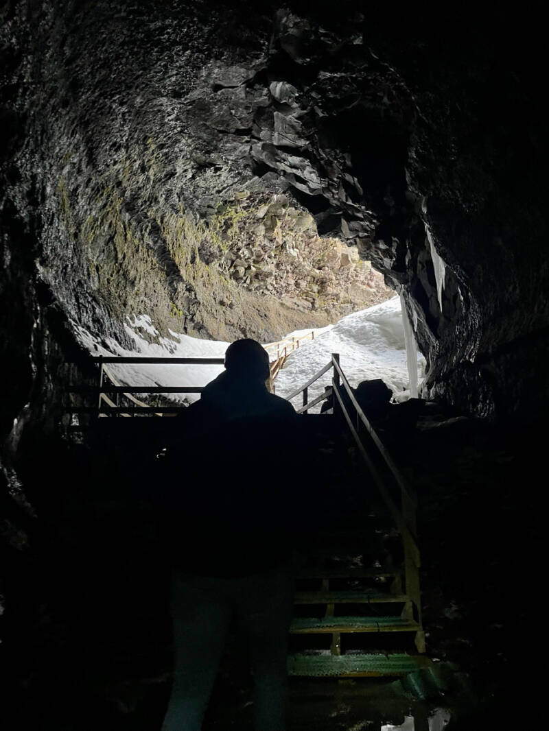 Uiteindelijk zijn we tot 39 meter diepte gedaald en zijn we 700 meter de grot in geweest en wat we zagen was veelzijdig en prachtig: kleine lavaformaties, grote spelonken en de overblijfselen van iemand die er zo'n 1000 jaar geleden, net na het verdwijnen van de lava, woonde. Tegen die tijd, 100 jaar na het verdwijnen van die lava, was het in de grot een aangename 25 tot 28 graden. Geen verkeerd plan dus. Aan het eind van de grot ervoeren we complete duisternis door alle lichten uit te doen en luisterden we een minuut in stilte naar het druppelende water en de stilte van de grot. Helaas moest de partner in crime van onze aanvoerder de stilte na 15 seconden verbreken met een idiote grap, maar dat vergeten we maar snel.