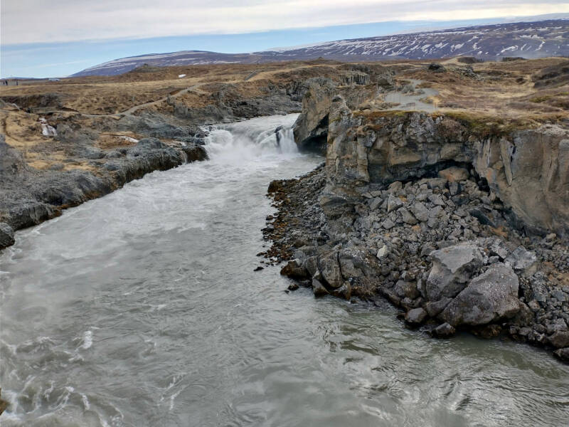 Van alle watervallen die we gezien hebben is de Godenwaterval, Godafoss, die met een enorm, oorverdovend in een kom neerstort, de mooiste tot nu toe. Ik ben er nog nooit geweest, maar de komvorm doet me denken aan de Niagara Watervallen op de grens van Canada en de V.S. Zo'n honderd meter stroomafwaarts bevindt zich de Geitafoss. Minder groot, maar zeker omdat je er praktisch naast kunt staan, niet minder indrukwekkend. Wanneer je de auto parkeert en de korte wandeling naar de Godafoss maakt (en hem dus ook nog niet ziet), voel je in de lucht het ijskoude water je gezicht al raken dankzij de immense kracht waarmee het water zich vermengt met het vervolg van de rivier. Een adembenemend stukje natuur.