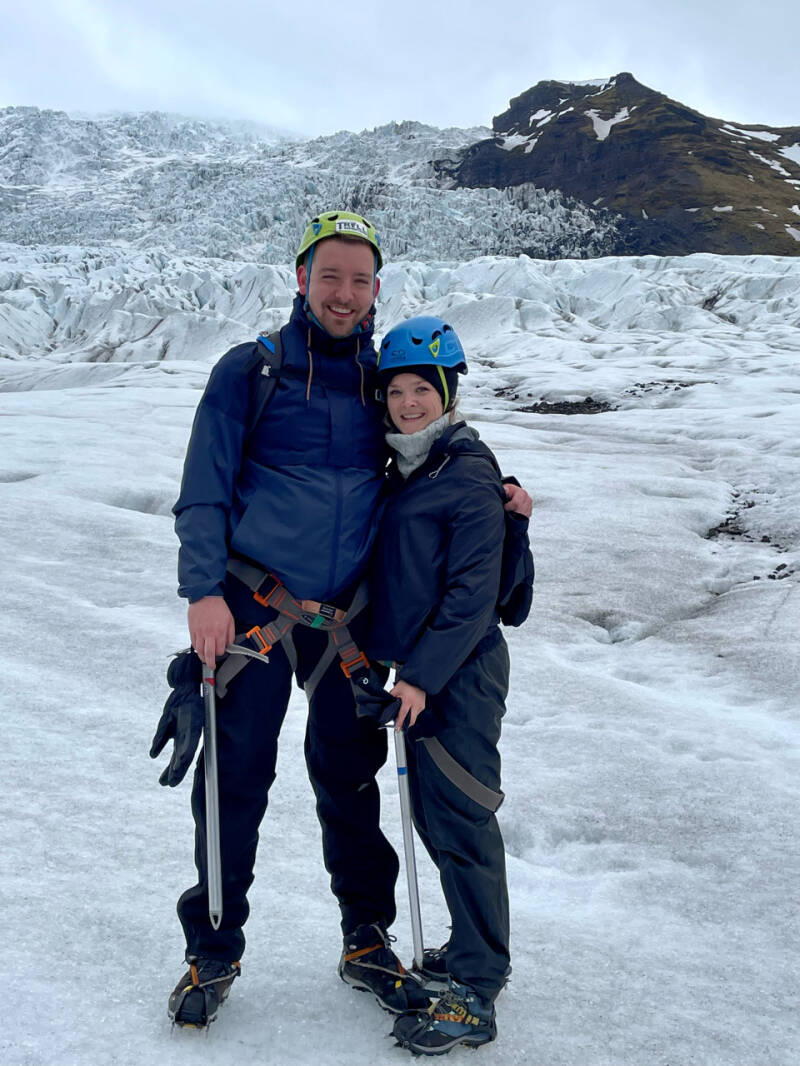 De gletsjerhike voelde als een echt avontuur. We kregen crampons (van die ijssteigers onder je schoenen), een ijsbijl, zekeringsmateriaal en een helm en onder toeziend oog van onze leuke, enthousiaste gids Huva liepen we naar de voet van de gletsjervinger. Daar lag een meer en dat meer (zie foto’s) was nog maar 18 jaar oud (de gok die het dichtstbij zat, was 1500 jaar). Het bestond volledig uit smeltwater van de gletsjer bestond. Dankzij klimaatverandering en ook door de versnelling daarvan wegens menselijke invloed smelt de gletsjer ’s zomers meer dan dat er aan ijs bijkomt. Sterker nog, deze tour die wij nu doen, zal over een jaar of twintig niet meer mogelijk zijn omdat de gletsjervinger tegen die tijd naar verwachting gesmolten zal zijn. Dat levert toch even een triest gevoel op en laat je denken over waar we als mensheid in godsnaam mee bezig zijn. Anderzijds zullen we na afloop van de tour weer in onze benzine- en dieselauto’s wegrijden, dus het blijft allemaal heel dubbel. Desondanks goed om er toch bij stil te blijven staan.