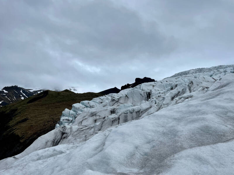 Dat melancholische gevoel verdwijnt daarna als sneeuw voor de zon (pun intended) wanneer we de gletsjer beklimmen. Huva legde even uit hoe we de gletsjer moesten bestrijden: blijkbaar moeten we als een soort gorilla’s met diarree over de gletsjer lopen. Benen wijd (anders steek je je eigen kuiten lek met je crampons), voeten hoog de lucht in, want anders val je, en de voeten plat neerzetten, zodat we zoveel mogelijk pinnen van de crampons gebruiken. De gletsjerhike kon beginnen. Eigenlijk kan ik niet anders zeggen dan dat het een prachtige ervaring was. We zagen diepe gletsjerspleten net zo prachtig lichtblauw waren als dat ze luguber aan diepte waren. We beklommen met behulp van touwen steilere stukken. We zagen zinkgaten die als drainage voor het gletsjerwater dienden (en een zekere dood betekenden voor mensen die erin zouden vallen). Het was fantastisch en avontuurlijk om mee te maken en zeker weten één van de hoogtepunten van onze reis. Op het eind deden we een vikingpush-up: in push-uphouding met je handen op je ijsbijl een slok water nemen van een kraakheldere en zuivere waterstroom op de gletsjer. De meesten begrepen het wel, maar ik luisterde natuurlijk weer niet goed en vergat het deel van het plaatsen van je handen op de ijsbijl. Doe dat echt als je er bent, want als je niet luistert dan zadel je jezelf op met vijf wondjes in je hand. IJs blijkt vlijmscherp te zijn.