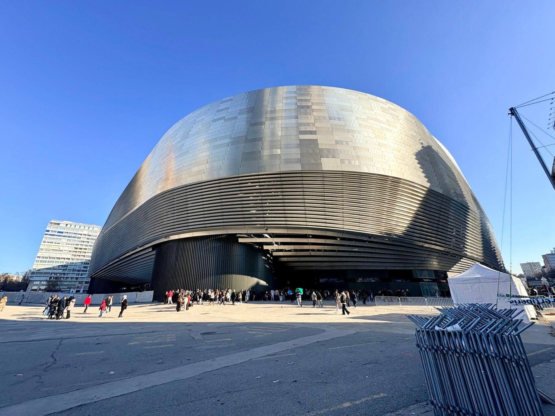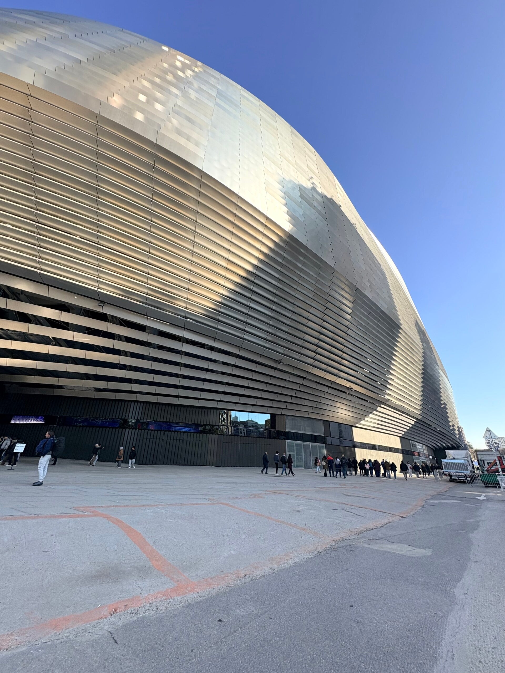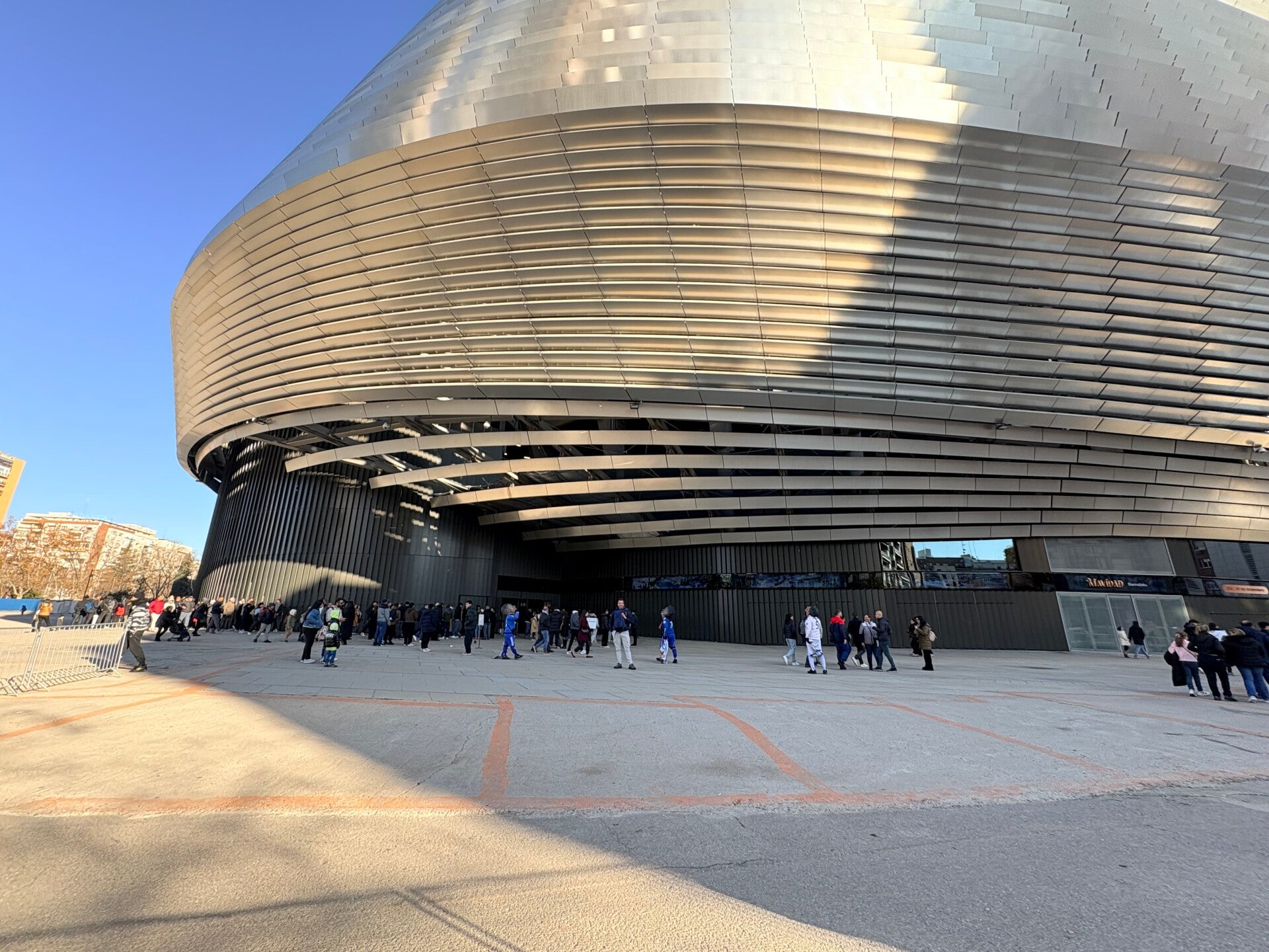 En een voetbaltempel is het ook wel. Het is Oudejaarsdag en er zijn op deze koude woensdagochtend – net als wij – nog genoeg andere zielen die de laatste dag van 2025 liever onder de rook van deze betonreus spenderen, dan met een paar rotjes en een grondbloem in een Jumbo-tas de buurt onveilig maken. Het is een machtig bouwwerk… maar is het wel het Santiago Bernabéu? Gelukkig zitten we wel degelijk goed, maar als ik één van ’s werelds grootste voetbalclubs was geweest, dan had ik wel wat meer mijn logo laten zien! Echt waar, we lopen langs de lange zijde van het gebouw, en dat fameuze logo van Real Madrid is nergens te ontwaren, afgezien van een relatief klein digitaal reclamebord waar af en toe de uitnodiging voor een stadiontour in combinatie met het logo voorbijkomt. Ik had het logo pontificaal op de lange zijdes geplakt. Nu zou je nog kunnen denken dat je langs een arena voor paardenraces wandelt of zo. (Of geldt dat alleen voor die echte wereldvreemden?)