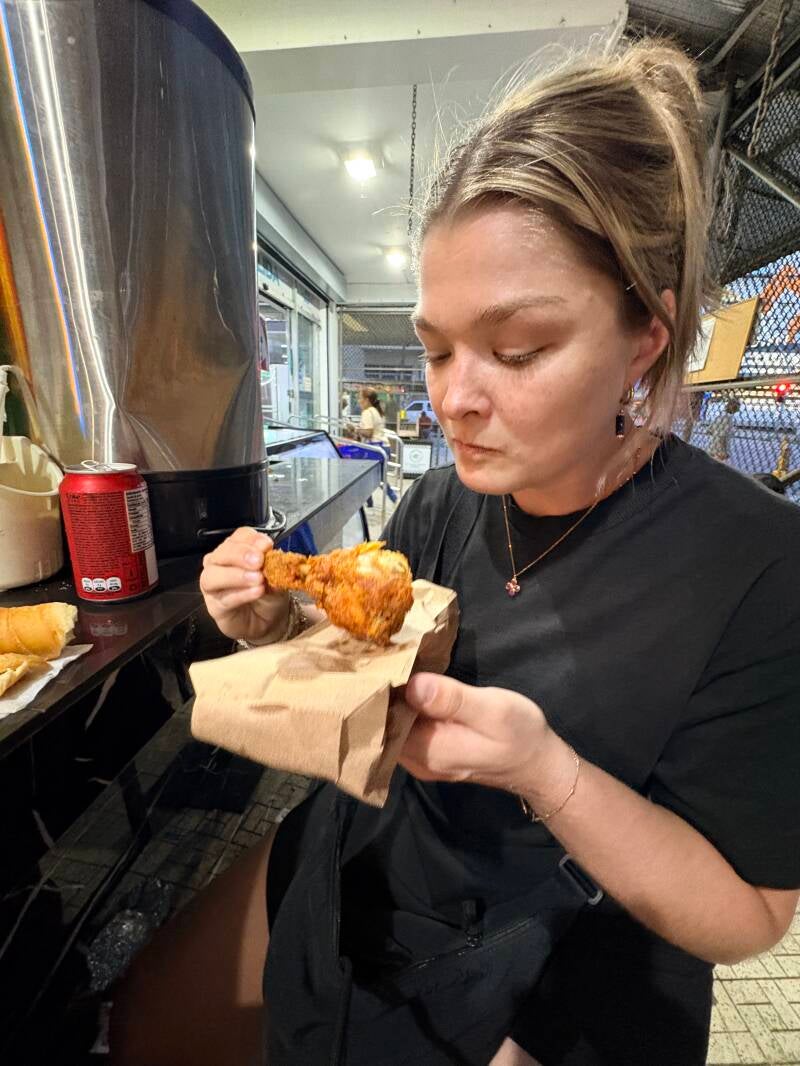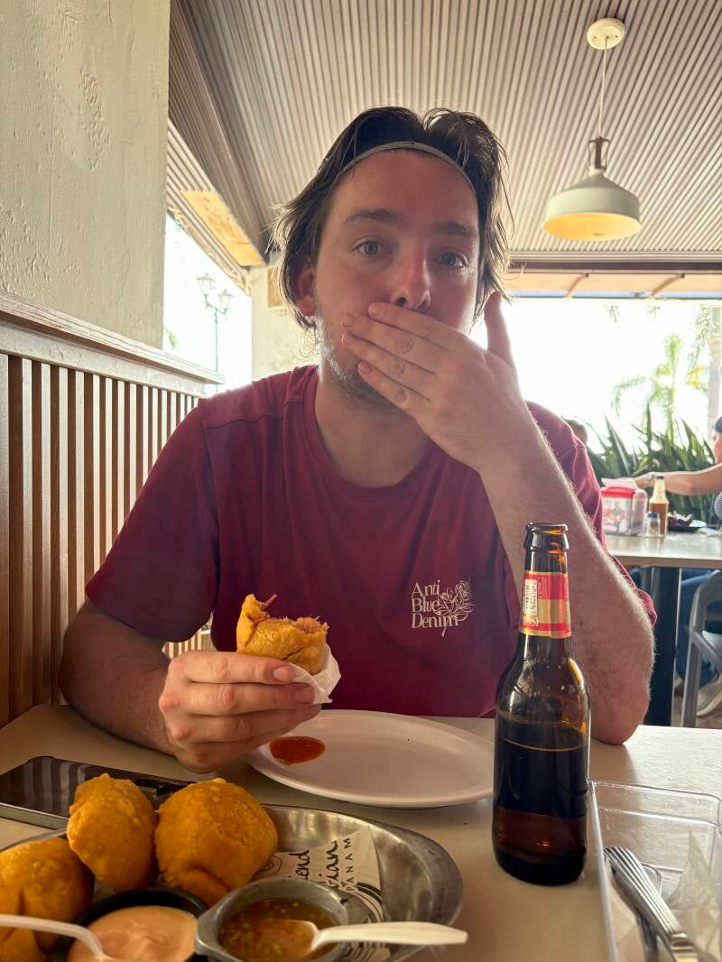 Uiteraard gaan we deze mijlpaal vieren met bier en een zwembad. Had ik al verklapt hé? We proberen nog even te videobellen met Joost, Manon en ons nieuwe neefje Obi, maar er wordt roet in het eten gegooid door de boxen die nét wat te hard de Caribische muziek door de speakers knallen. De mond van Joost beweegt, maar we zijn nog niet bedreven genoeg in liplezen zo blijkt. We spreken een andere dag af. Buiten bier en zwemmen gaan we alleen nog even naar de supermarkt tegenover waar we ook een leuke buitenbar vinden die allemaal Panamese gerechtjes verkopen. Geen avondvullende maaltijd, maar we hebben ook nauwelijks honger, dus we eten vandaag heel lokaal, kluiven een kip af tot het bot en maken twee deegstengels met kaas soldaat. We zitten nog steeds in dat lugubere wijkje, we weten het, maar hier is het goed verlicht, druk met mensen en zit het onderbuikgevoel wel goed. Een uur later, wanneer we de straat weer oversteken om naar bed te gaan, trekken we de conclusie dat we ons onderbuikgevoel best kunnen vertrouwen.