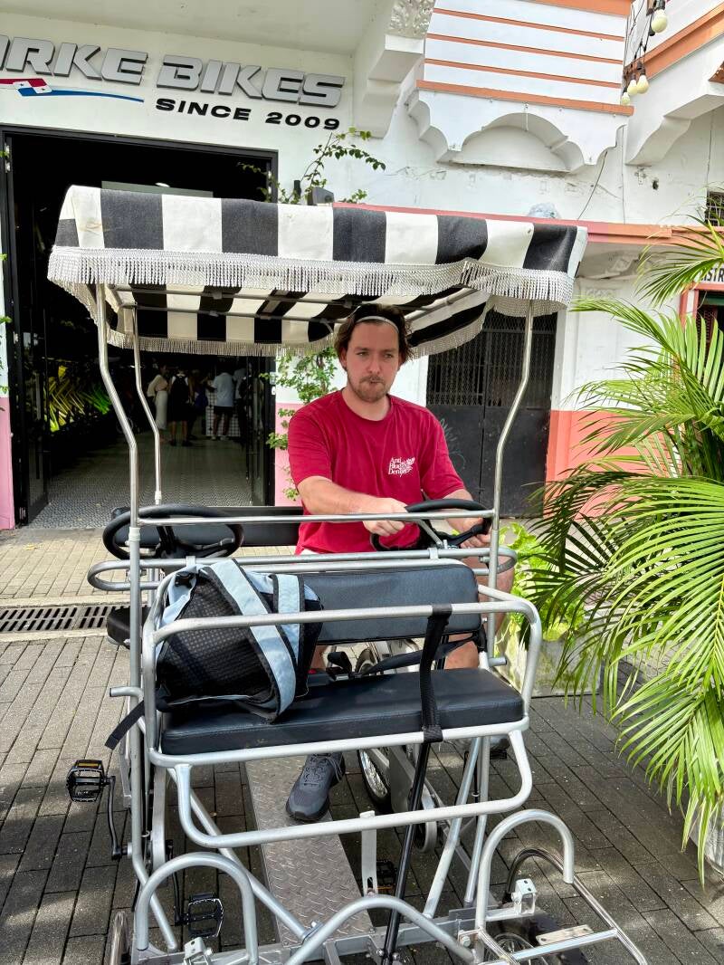 We leveren na een kleine vier uur trappen onze overdekte tandem weer in, pakken een terrasje en doen ons tegoed aan een vijftal overheerlijke empanada’s, alvorens we een Über nemen naar het oude centrum. Een kind kan de was doen als het om Übers gaat, maar de Panamezen maken het ons niet altijd even gemakkelijk. We hebben inmiddels zo’n 35 landen gezien, maar dit is het eerste land waar de auto’s géén nummerborden aan de voorkant hebben! Kijk, als je normaliter een Übertje neemt, dan kijk je altijd naar die nummerborden, toch? Nu kan zo’n hele straat vol auto’s staan, maar weet je pas dat je Über er is wanneer die je voorbij is gereden, maar goed, dat maakt het ook wel weer leuk allemaal. Maar wat hebben die auto’s dan wel voorop? In de meeste gevallen helemaal niks, maar we hebben ook al gezien dat die voorkant naar eigen invulling vormgegeven wordt. Soms staat er wel eens in grote letters het automerk op, alsof het logo vijf centimeter hoger de fabrikant nog niet verraden had. We hebben ook al een chauffeur langs zien komen die zich identificeert als pitbull. Als klap op de vuurpijl was er een witte Toyota die in felpaars op een wit veld ‘OnlyFans’ en twee dansende vrouwen heeft laten drukken en daar de blits mee dacht te maken. Ieder zijn ding natuurlijk.