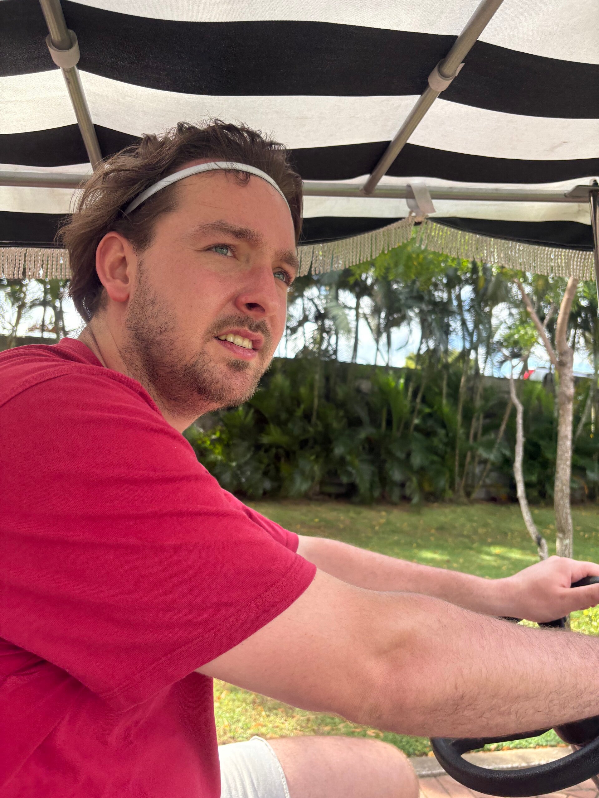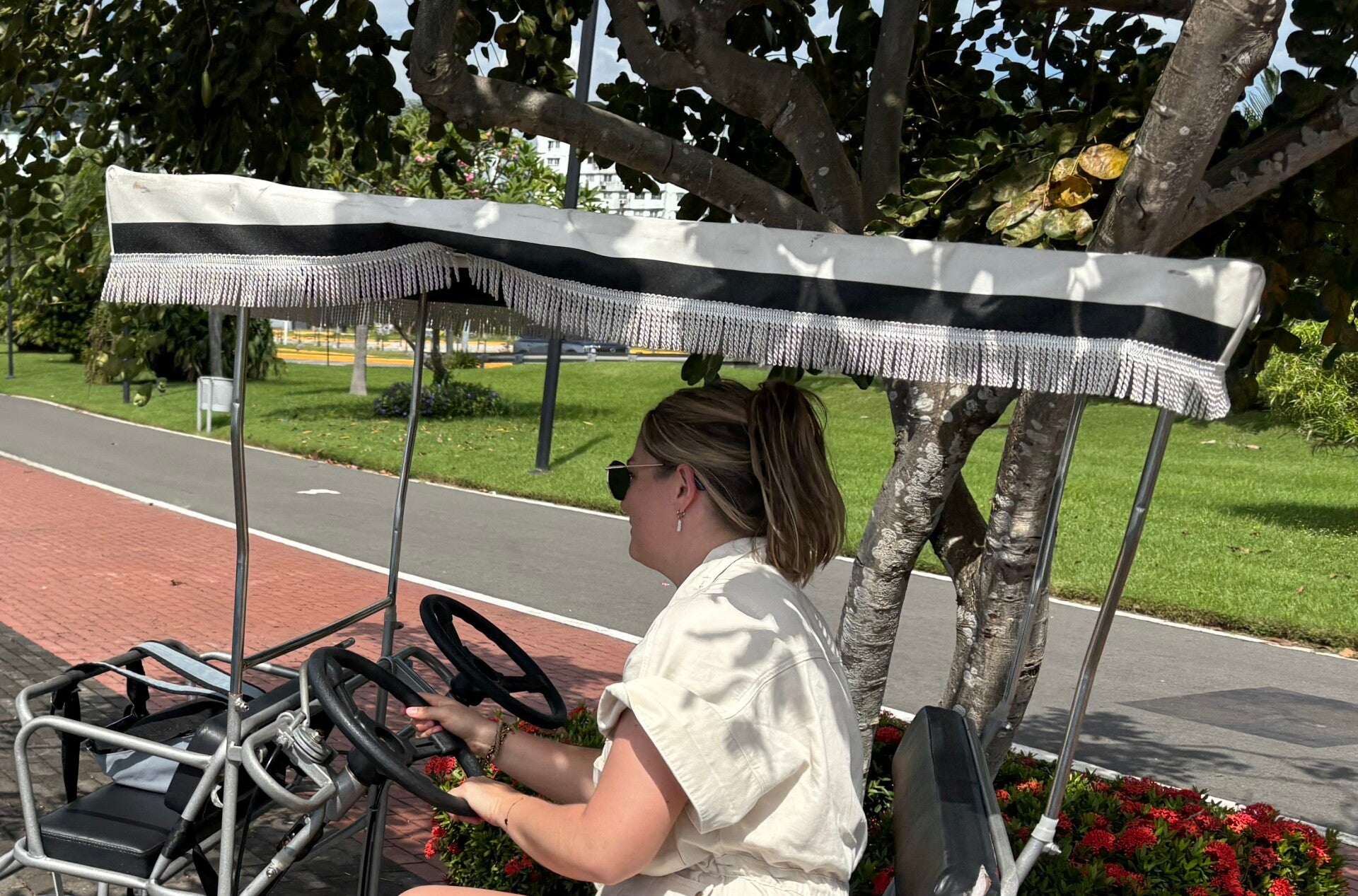 De voorspelling van de Koreanen klopt aardig. We gaan naar binnen en huren een fiets en niet zomaar één. Geen bliksemsnelle e-bike. Geen mountainbike waar we de Amazone mee kunnen trotseren. Geen wielrenfiets die de 50km/u aantikt. Nee, een vierwieler zoals je die ook ziet bij de buggy-auto’s in de Efteling! Och, wat gaan die dingen daar traag, maar we komen er snel achter dat die van ons niet veel sneller dan stapvoets gaat. Maar daar tekenen we voor. Naast het functionele overkappinkje (mijn huid begint al Ierse kleuren te krijgen), hebben we er de grootste lol mee.