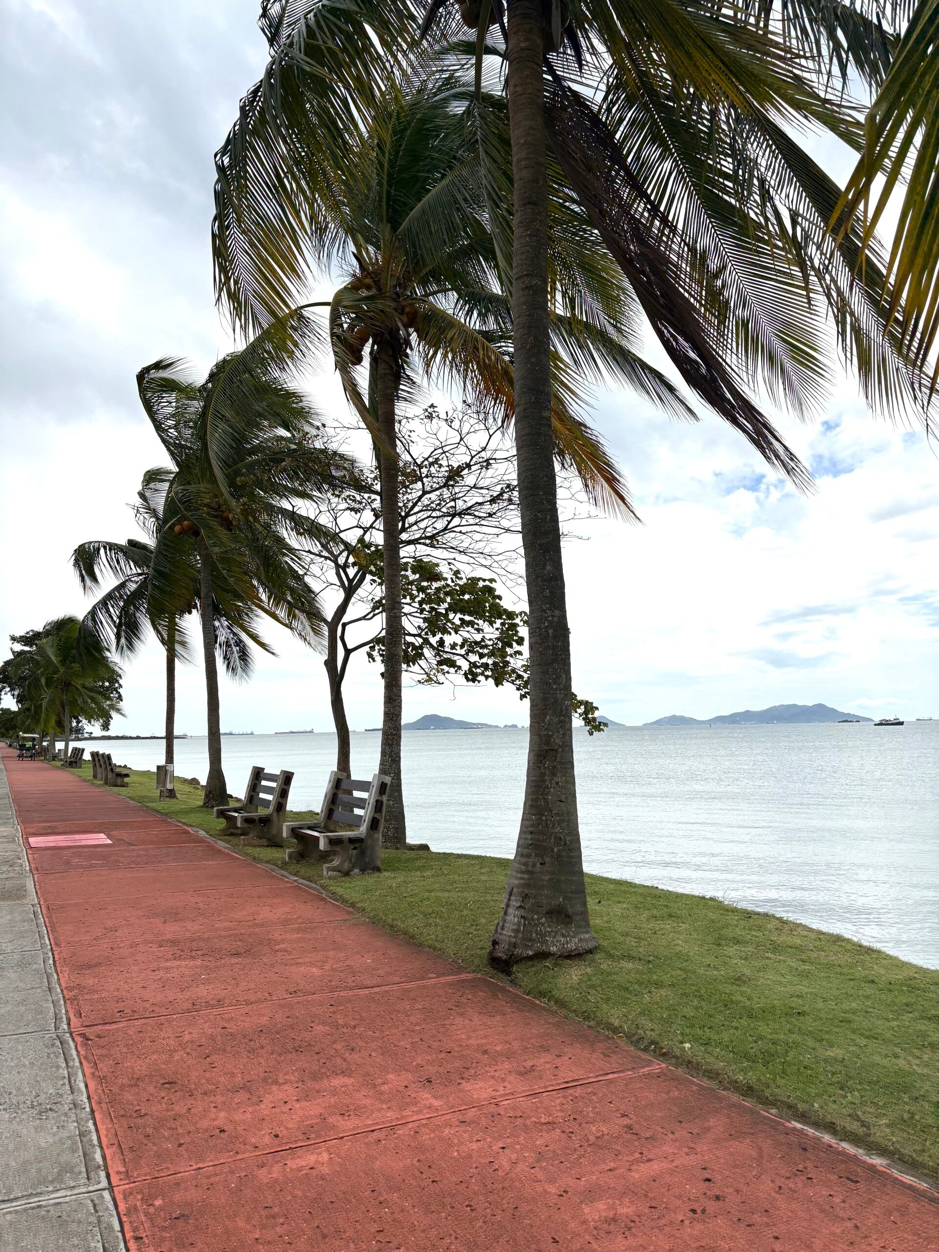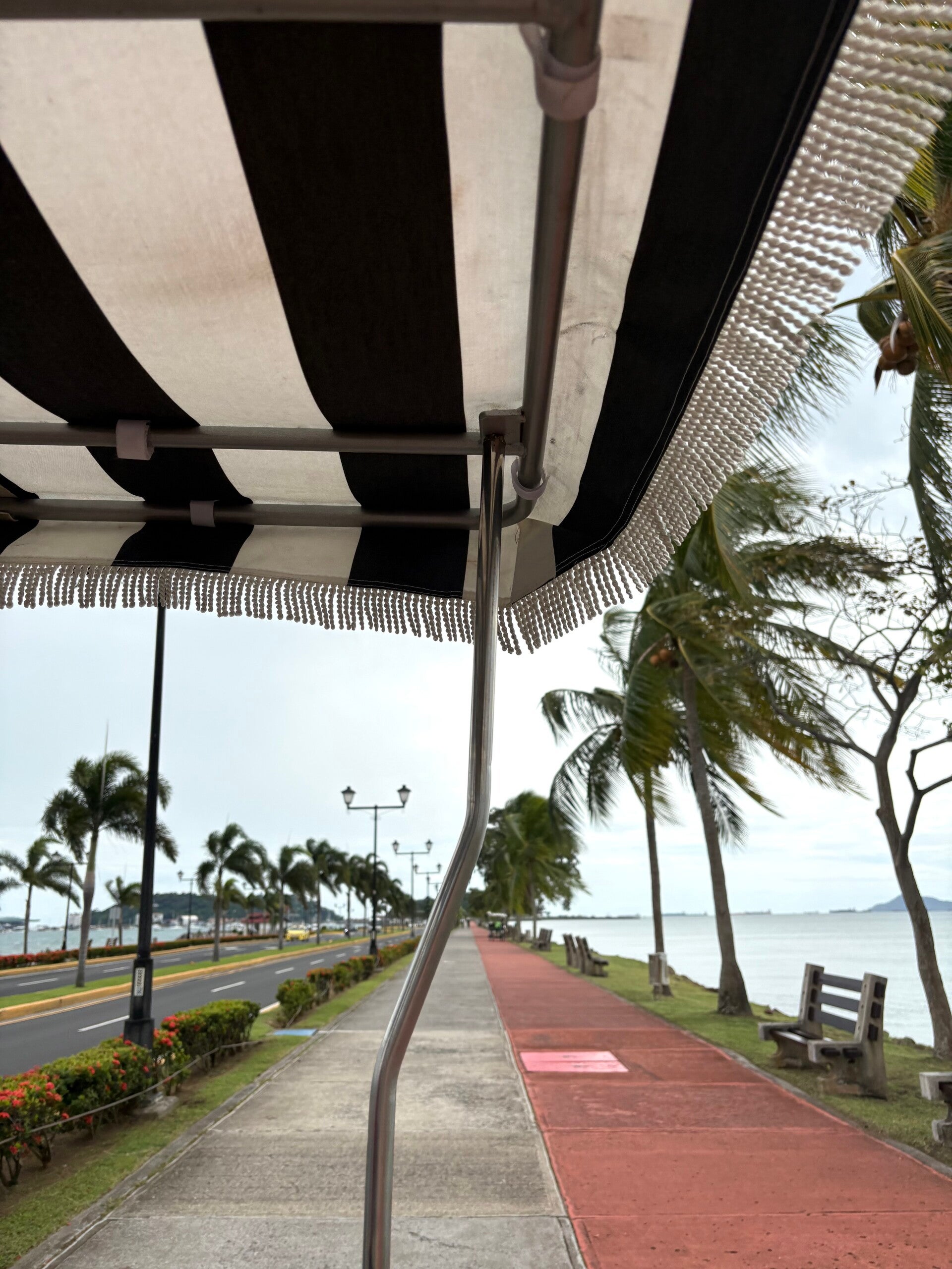 Daarna maken we een betere keuze. Weer terug bij ons hotel lopen we een andere kant op, richting het strand: het kilometerslange boulevardgedeelte van de Cinta Costera, de kustweg die oud en nieuw met elkaar verbindt. En belangrijk: hier is het wél veilig! Aan de ene kant de Stille Oceaan en aan de andere kant een oceaan van groen. De complete kustroute, waar alleen fietsers en wandelaars over het pad mogen, is versierd met nog gesloten kraampjes, palmbomen en lichtjes.