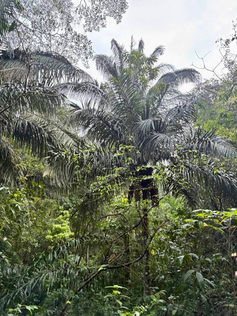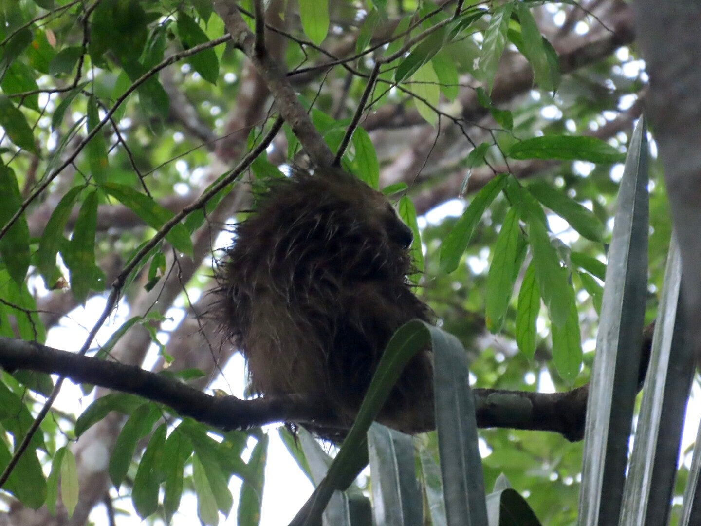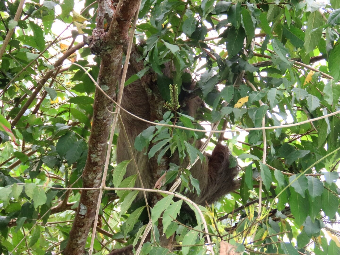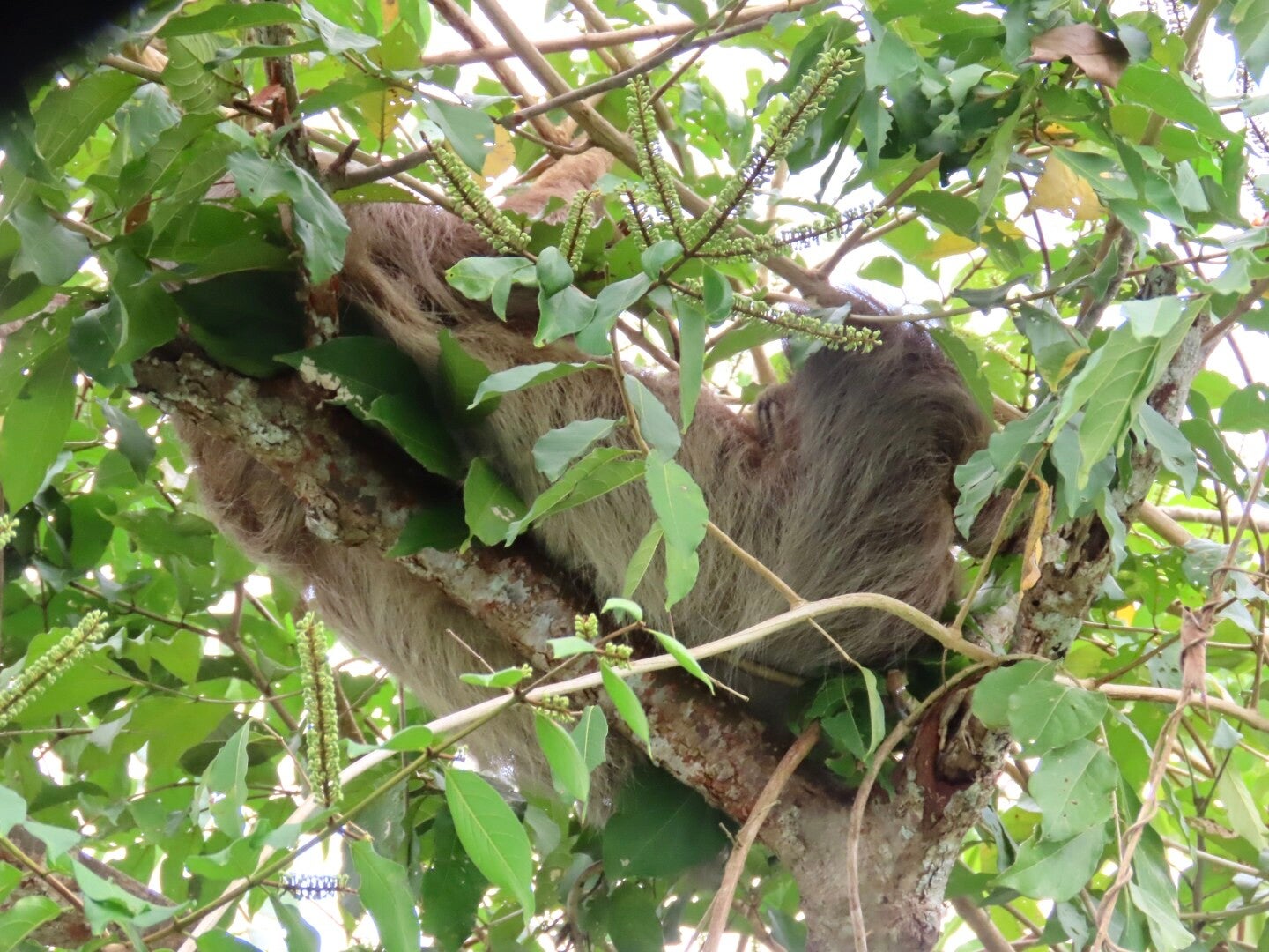 We worden om zes uur opgehaald door gids Mario en we hebben een grote groep van twintig, dus de standaard junglewandeling die bij deze tour is inbegrepen (bijzonder om in veertig minuten van het hartje van de stad opeens midden in de jungle te staan), gaat niet over een trail maar over een brede onverharde weg. Niet de mooiste wandeling, maar oké: het doel van deze wandeling is luiaards spotten. En dat lukt! We spotten een tweevingere luiaard. Hij zet wel hoog, dus we kunnen ‘m niet goed zien. Wel leuk dat het gelukt is.
