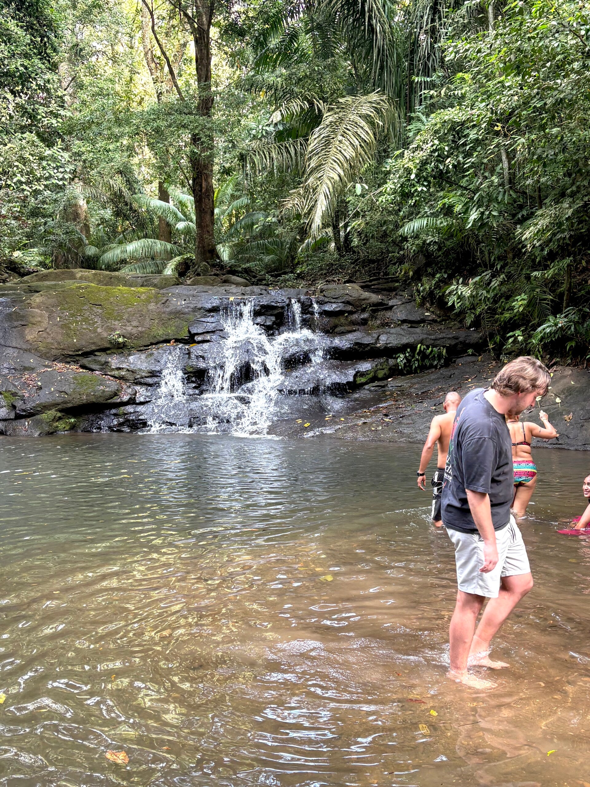 We varen terug en stappen de bus in. We hebben nog één stop: een natuurlijk zwembad bij een waterval waar Geertje en ik een duik in wagen. Heerlijk verkoelend en ik ben al lang blij dat Geertje meegaat, want naast ons zijn het alleen Anthony en Vic van onze groep die er ook in springen. Het is namelijk zo dat als ik water zie en het is er veilig: dan moet ik er in. Geertje ervaart die hunkering vaak niet zo, maar tot haar eigen vreugde is ze ditmaal geen pretbederver en geniet ze ook wel van deze afkoeling van de dag.