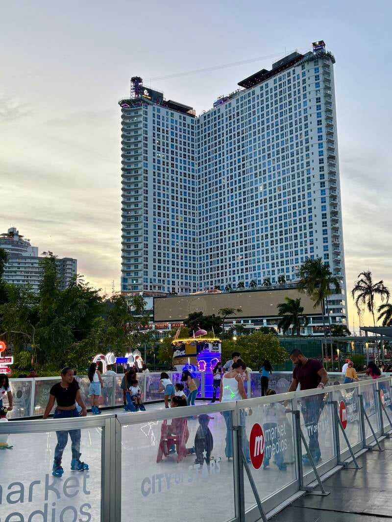 Het is weer heerlijk en er gebeurt weer van alles. Als we een van de inmiddels kenmerkende rode bruggen oversteken, duwt een jongen met zijn vriendin zijn oma in een rolstoel voort. Ze is oud, maar de kleine glimlach verraadt dat daar een avond gecreëerd wordt die de oma nooit meer zal vergeten. Op een van de vele pleintjes danst een groep inheemse mannen en vrouwen een ludieke dans, waarbij de vrouwen rondjes huppelen en de mannen in een soort springende foetushouding ritmisch een hypnotiserend deuntje panfluiten. Helaas kunnen we geen filmpjes op de site plaatsen met ons huidige abonnement, anders hadden we dat gedaan. Even verderop ontwaren we een lange rij die uiteindelijk voor een – hoe bedenk je het in een tropische stad? – kunstschaatsbaan blijkt te zijn, maar je hoeft geen kenner te zijn om te zien dat de nieuwe Sven Kramer of Jutta Leerdam hier niet tussen schaatst.