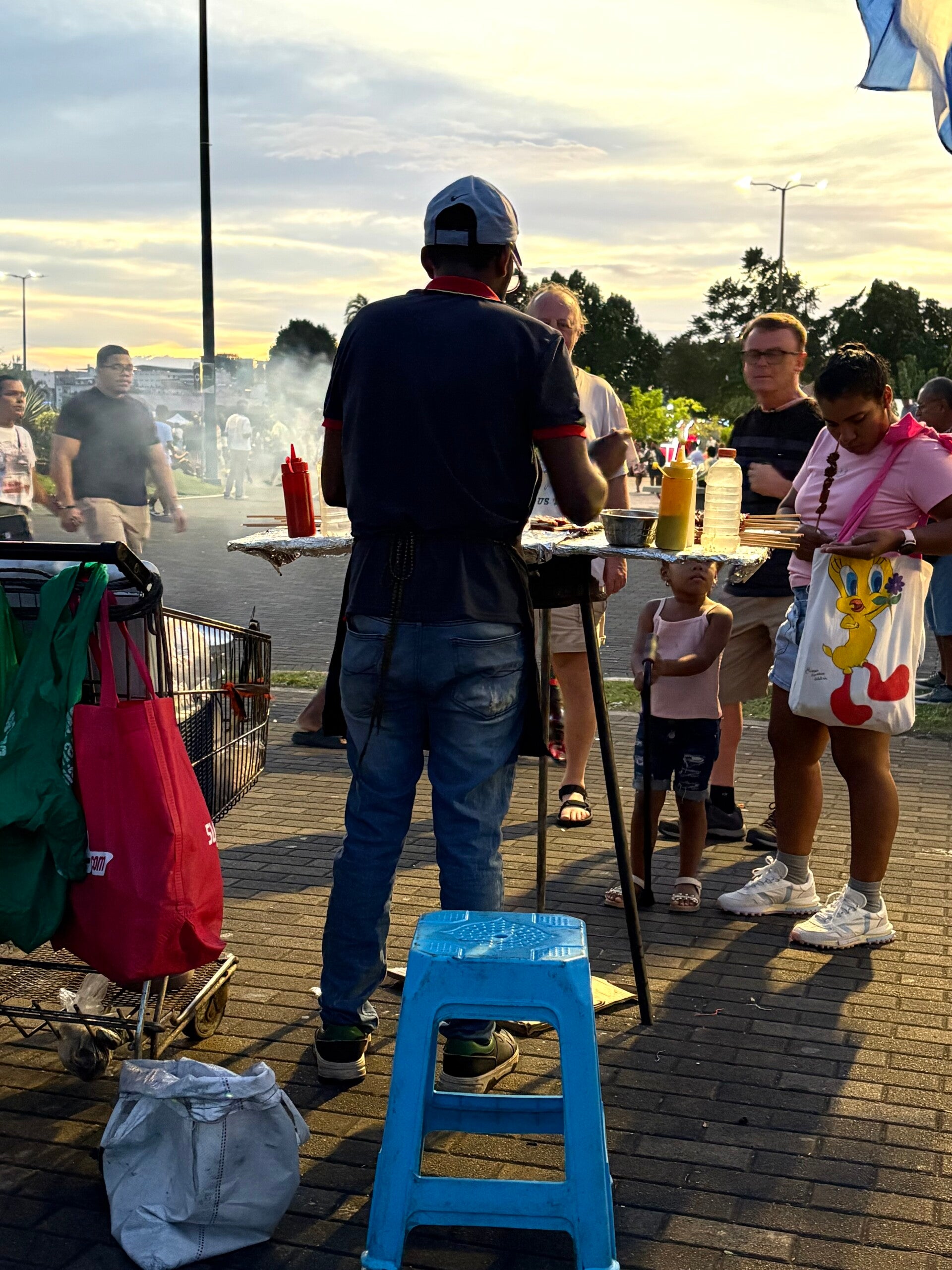 We bellen even naar oma (die is jarig op 4 januari, en gezien het tijdsverschil is het net 12 uur geweest), lachen wat, en lopen de Cinta Costera verder noordwaarts af. Terwijl Geertje de getallen van één tot tien oefent in het Spaans, halen we voor een prikkie wat streetfood en raak ik in gesprek met een Panamees. Kunnen we allebei ons Spaans even oefenen.
