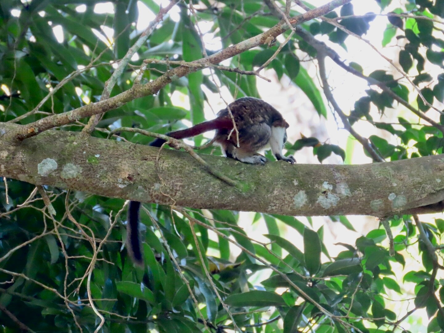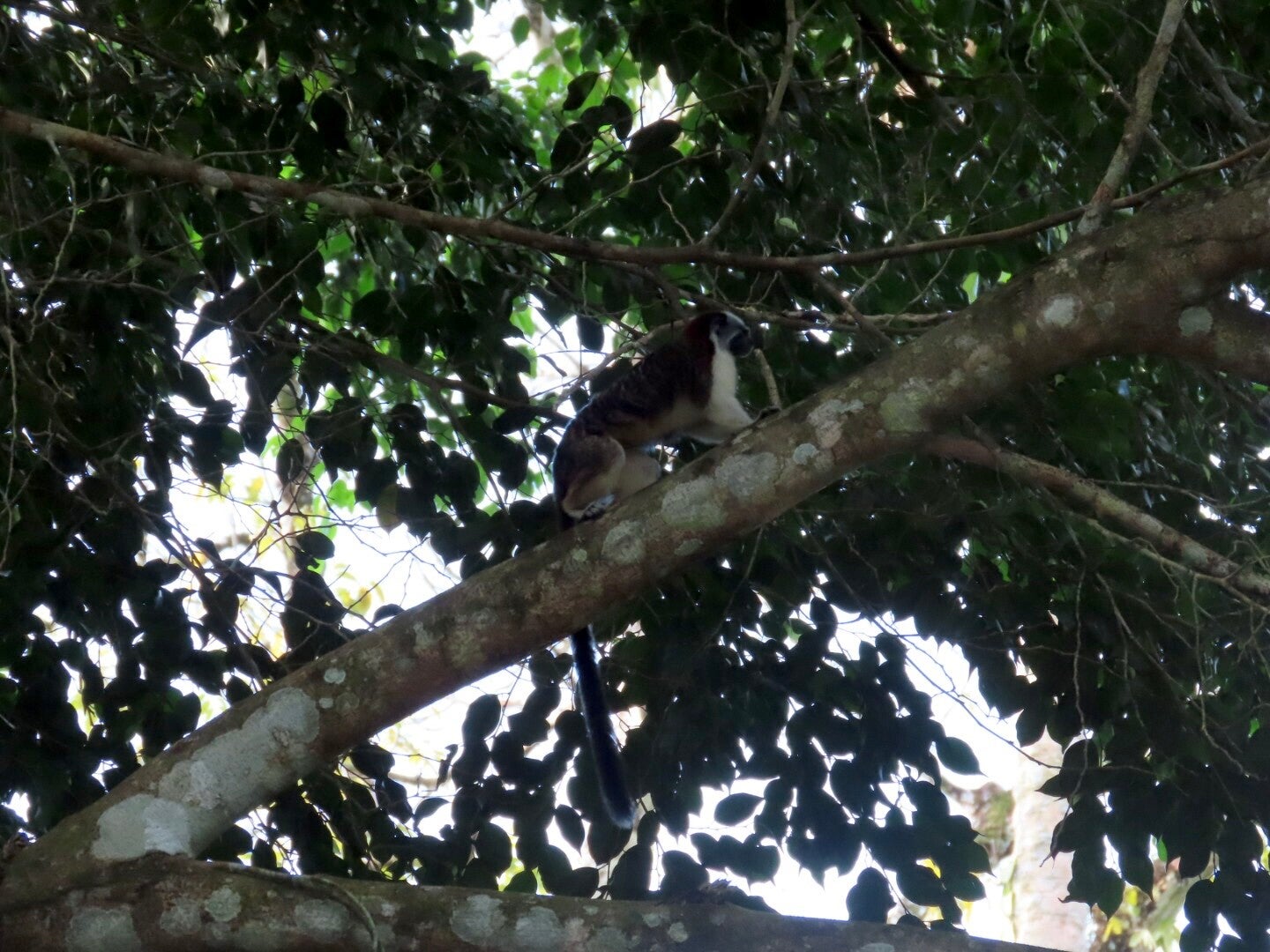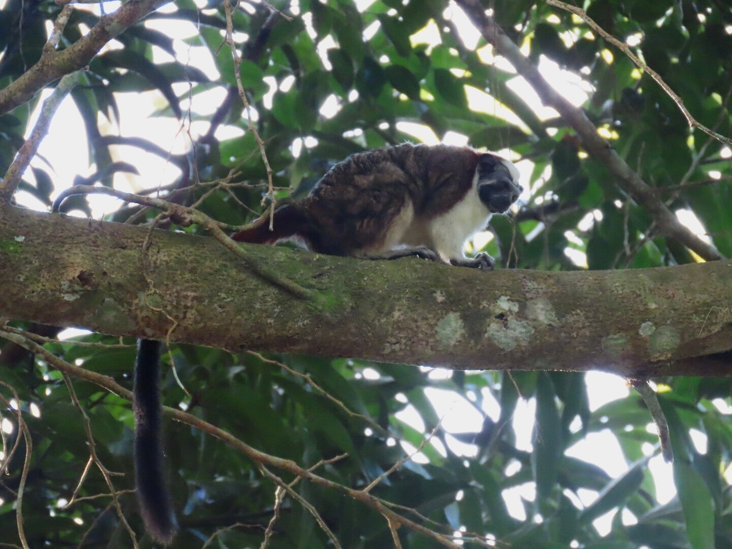 Er leven hier vier apensoorten: drie overdag en één apensoort is een nachtdier, dus die gaan we niet zien. De derde zijn die tamarijnaapjes die we eerder in het dorp al zagen, maar ook nu worden we daar wéér op getrakteerd en ditmaal van wel heel dichtbij: één tamarijnaapje komt op een tak zo’n halve meter van Geertjes neus zitten. Wat hij doet? Schreeuwen en gillen. Geen idee waarom, maar het is wel weer retegaaf.