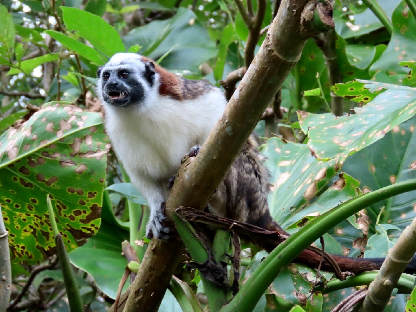 En dan draaien we ons om. “MONKEYS!” roept Anthony, een jolige Trinidadiaanse toerist die met zijn vrouw Vic op vakantie is en precies het accent van Bob Marley heeft. En inderdaad: aan de overkant van de straat proberen vijf piepkleine tamarijnaapjes via het bladerdek de weg over te steken. Echt, serieus: wat is dit voor tour? We zijn gewoon in een dierentuin beland!
